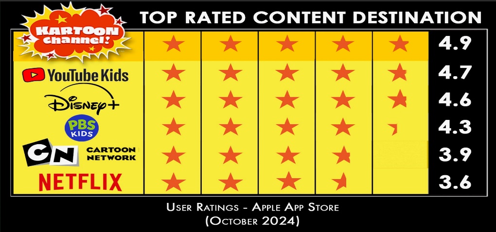 | · | 卡通频道!美国发行量现已增长至18个平台,包括,亚马逊Prime Video、Apple TV、Amazon Fire、Apple iOS、Android Mobile、Android TV、Web、Roku、Pluto TV、康卡斯特、Cox、Dish、Sling TV、Tubi、XUMO、三星、LG智能电视,同时在苹果应用商店中的观众收视率继续领先于Netflix、Disney + You Tube Kids、Max和PBS Kids | |