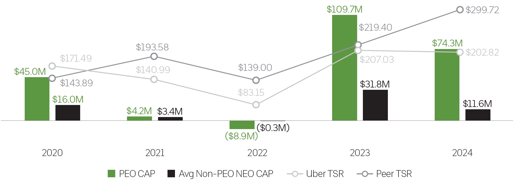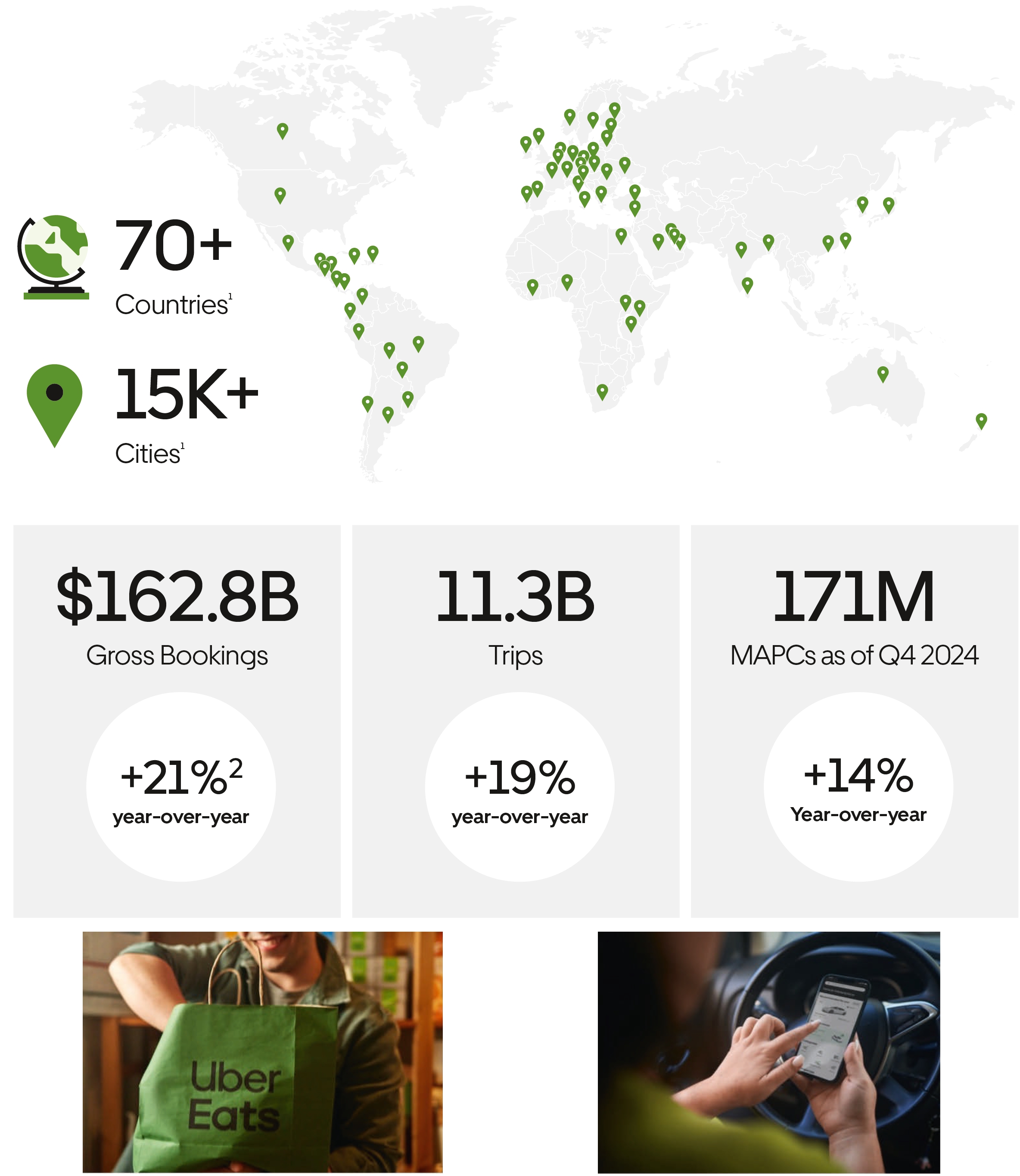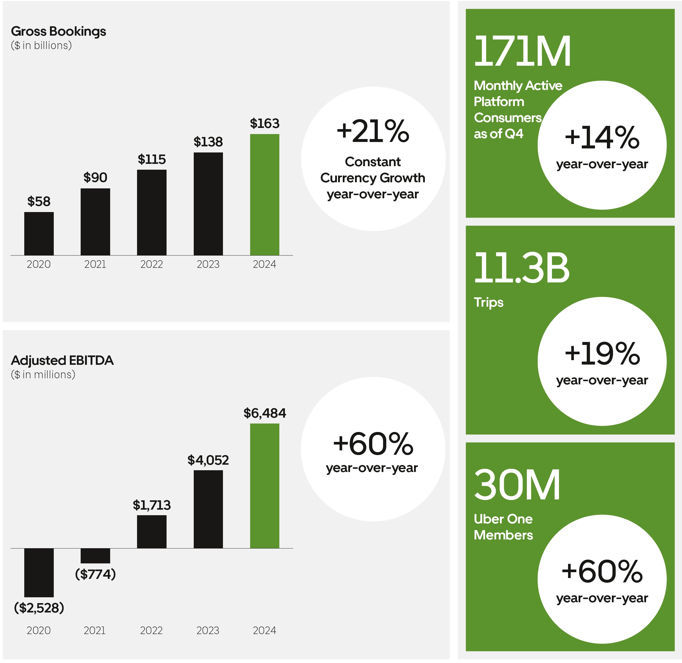 我们代表我们整个董事会,感谢您对优步的持续支持。2024年是运营表现持续强劲的一年。优步以有史以来最强劲的一个季度结束了2024年,出行次数、总预订量和调整后EBITDA均创下历史新高。该公司在过去五个季度中有四个季度实现了21%的同比增长,而且——更值得注意的是——其2024年全年21%的同比增长超过了2023年的强劲表现。优步的业绩一直受到跨多个优先事项的快速创新和执行的推动,包括通过多个新的合作伙伴关系推进其自动驾驶汽车计划,包括其首次国际发布。