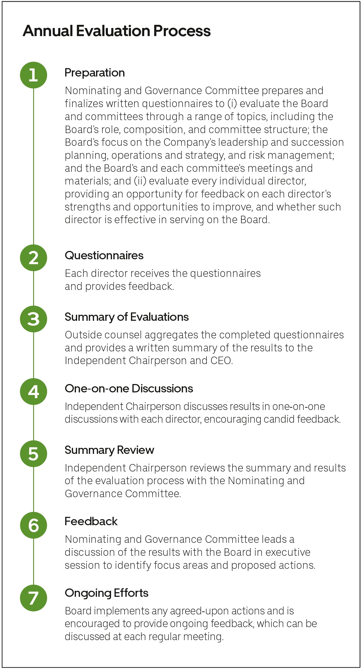 | ● | 提名和治理委员会和董事会根据公司治理准则中列出的选择标准对每位被提名人进行评估,包括股东推荐的那些被提名人。 |