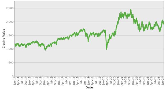 下图显示的是标普 500指数的收盘价®2014年1月2日至2024年1月30日期间,每天都有此类数值的索引。我们从Bloomberg L.P.获得了收盘数值,未经独立验证。你不应该把历史收盘价值作为未来表现的指标。
