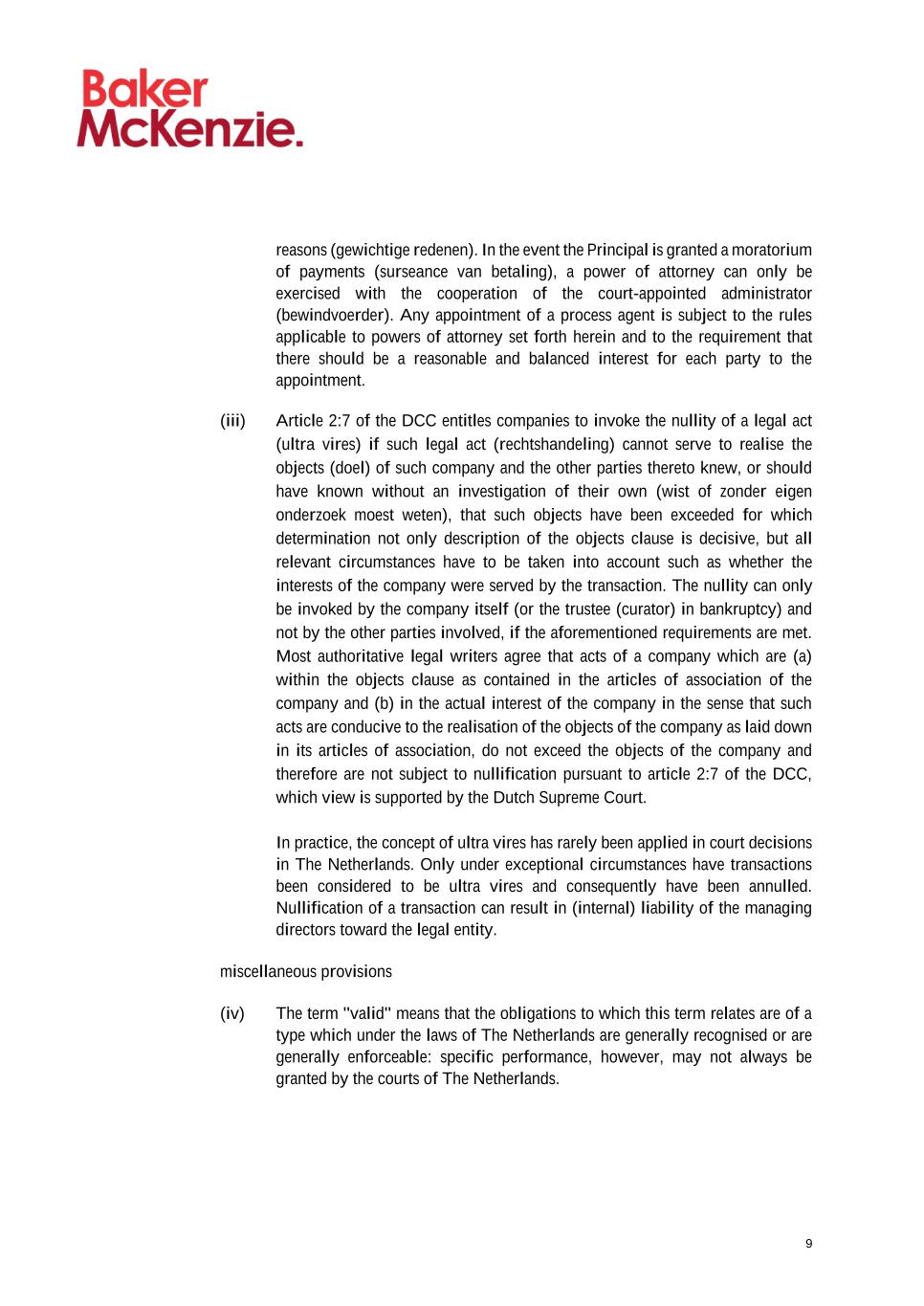 9个原因(gewichtige redenen)。如果委托人被授予暂停付款(surseance van betaling),授权书只能在法院指定的管理人(bewindvoerder)的合作下行使。任何过程代理人的任命均须遵守此处规定的适用于授权书的规则,并遵守对任命的每一方应有合理和平衡的利益的要求。(iii)DCC第2:7条规定,如果该法律行为(rechtShandeling)不能用于实现该公司的对象(doel),且该公司的其他当事人知道或本应在未经自身调查(wist of zonder eigen onderzoek moest weten)的情况下知道,已超过该等对象,其确定不仅对象条款的描述具有决定性,而且还必须考虑所有相关情况,例如该交易是否为公司的利益服务,则公司有权援引该法律行为的无效(越权)。在满足前述要求的情况下,无效只能由公司本身(或破产中的受托人(管理人))援引,不能由其他相关方援引。大多数权威法律作者同意,一家公司的行为,如果是(a)在公司章程所载的客体条款范围内,以及(b)在公司章程规定的这种行为有利于实现公司客体的意义上符合公司的实际利益,则不会超出公司的客体,因此根据DCC第2:7条不受作废的约束,荷兰最高法院支持这一观点。在实践中,越权概念很少在荷兰的法院判决中应用。只有在特殊情况下,交易才被视为越权并因此被废止。交易作废可能导致董事总经理对法人实体的(内部)责任。杂项规定(iv)术语“有效”是指该术语所涉及的义务属于荷兰法律一般认可或一般可强制执行的类型:然而,具体履行可能并不总是由荷兰法院授予。