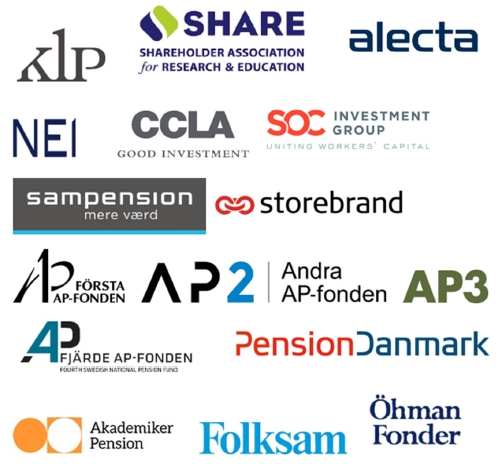 1支持者包括以SHARE、FJ ä rde AP-fonden(AP4)、E. Ö hman J:or Fonder AB、Storebrand Asset Management、KLP Kapitalforvaltning AS、Kapitalforeningen MP Invest、Tredje AP-fonden(AP3)、Alecta Tj ä nstepension Ö msesidigt、CCLA Investment Management Limited、the Folksam Group、Kapitalforeningen Sampension Invest、Andra AP-fonden(AP2)、SOC Investment Group、Amundi Asset Management、PensionDanmark、F ö rsta AP-fonden(AP1)、Bright Start College Savings Trust、Cardano Risk Management B.V.、