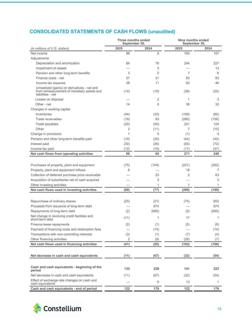 合并现金流量表(未经审计)截至9月30日止三个月、截至9月30日止九个月、(百万美元)2025202420252024净收入888162107调整折旧和摊销8476244227资产减值— 5 — 13养老金和其他长期福利3276财务成本-净额27318383所得税费用38118246衍生工具的未实现(收益)-净额和重新计量货币资产的收益和负债-净额(14)(19)(38)(20)处置损失— 213其他-净额1463632营运资金存货变动(44)(33)(109)(60)贸易应收款项(19)83(280)(158)贸易应付款项(20)(40)221124其他2(11)7(15)拨备变动15(1)3支付的养老金和其他长期福利(19)(20)(44)(42)支付的利息(30)(26)(83)(72)支付的所得税(12)(15)(17)(37)经营活动产生的现金流量净额9965271240购买物业、厂房及设备(75)(104)(221)(262)物业,厂房及设备流入6 — 187收回递延应收货款— 23263收购子公司扣除取得的现金— 3 — 3其他投资活动— 111投资活动使用的现金流量净额(69)(77)(200)(188)回购普通股股份(25)(21)(75)(60)发行长期债务所得款项— 674 — 674偿还长期债务(2)(685)(5)(690)循环信贷额度和短期债务净变动(11)1171偿还融资租赁款项(2)(1)(5)(6)支付融资费用及赎回费—(14)—(14)与非控股权益的交易(3)(1)(7)(4)其他筹资活动2(8)(28)(7)筹资活动使用的现金流量净额(41)(55)(103)(106)现金及现金等价物净减少额(11)(67)(32)(54)现金及现金等价物-期初13328141223现金及现金等价物净减少额(11)(67)(32)(54)汇率变动对现金及现金等价物的影响— 9131现金及现金等价物-期末12217012217015