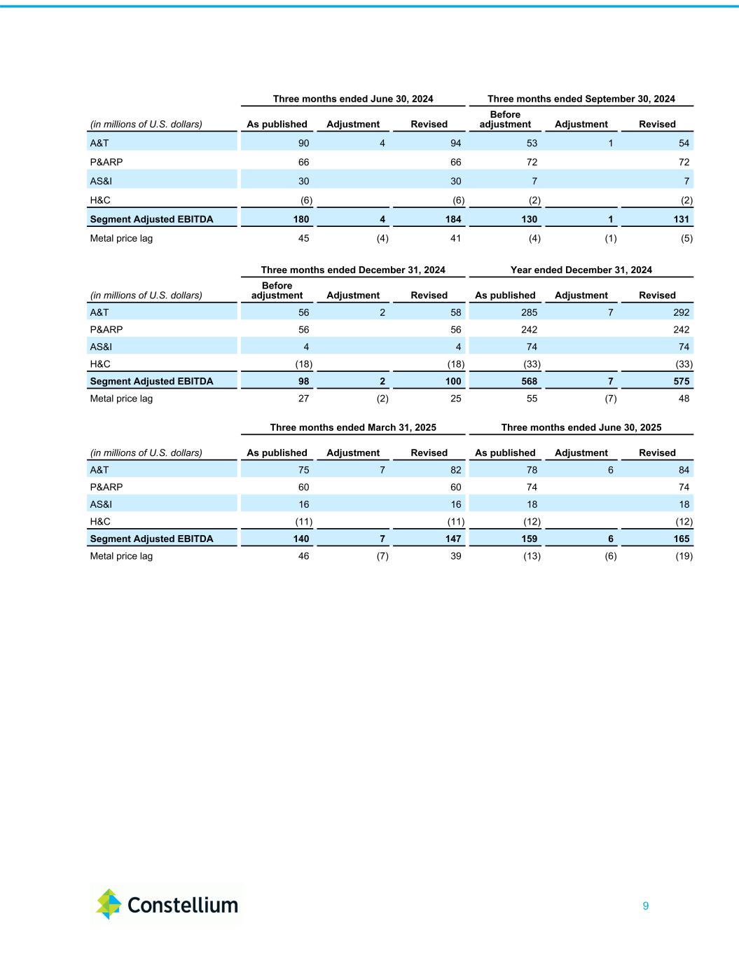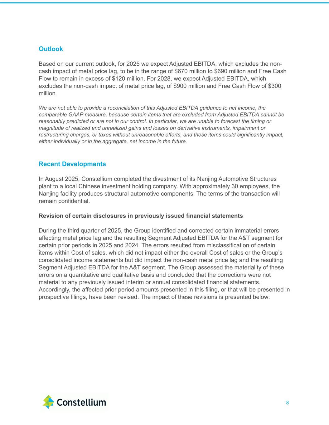 展望基于我们目前的展望,对于2025年,我们预计不包括金属价格滞后的非现金影响的调整后EBITDA将在6.7亿美元至6.9亿美元之间,自由现金流将保持在1.2亿美元以上。对于2028年,我们预计不包括金属价格滞后的非现金影响的调整后EBITDA为9亿美元,自由现金流为3亿美元。我们无法提供这一调整后EBITDA指引与净收入(可比的GAAP衡量标准)的对账,因为某些被排除在调整后EBITDA之外的项目无法合理预测或不在我们的控制范围内。特别是,我们无法在没有不合理努力的情况下预测衍生工具、减值或重组费用或税收的已实现和未实现损益的时间或幅度,而这些项目可能会对未来的净收入产生重大影响,无论是单独影响还是总体影响。最新动态2025年8月,Constellium完成了将南京汽车结构工厂剥离给一家中国本土投资控股公司的工作。该南京工厂拥有约30名员工,生产汽车结构部件。交易条款将继续保密。修订先前发布的财务报表中的某些披露2025年第三季度期间,集团识别并更正了影响金属价格滞后的某些非实质性错误以及由此产生的A & T部门在2025年和2024年某些先前期间的分部调整后EBITDA。这些错误是由于销售成本中某些项目的错误分类,这既不影响整体销售成本,也不影响集团的综合损益表,但确实影响了非现金金属价格滞后以及由此产生的A & T部门的分部调整后EBITDA。该集团在数量和质量的基础上评估了这些错误的重要性,并得出结论认为,这些更正对以前发布的任何中期或年度综合财务报表都不重要。因此,在本次申报中提出的或将在预期申报中提出的受影响的前期金额已被修订。这些修订的影响列示如下:8