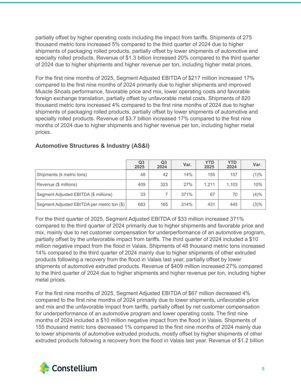 部分被包括关税影响在内的更高运营成本所抵消。与2024年第三季度相比,27.5万吨的出货量增加了5%,原因是包装轧制产品的出货量增加,但部分被汽车和特种轧制产品的出货量减少所抵消。营收13亿美元,与2024年第三季度相比增长20%,原因是出货量增加,每吨收入增加,包括金属价格上涨。就2025年前9个月而言,分部调整后EBITDA为2.17亿美元,与2024年前9个月相比增长17%,这主要是由于出货量增加和肌肉浅层性能的改善、有利的价格和组合、较低的运营成本和有利的外汇折算,部分被不利的金属成本所抵消。与2024年前9个月相比,出货量为82.0万吨,增长4%,原因是包装轧制产品的出货量增加,但部分被汽车和特种轧制产品的出货量减少所抵消。由于出货量增加和每吨收入增加,包括金属价格上涨,收入为37亿美元,与2024年前9个月相比增长了17%。汽车结构与工业(AS & I)Q3 2025 Q3 Q3 2024 Var。年初至今2025年年初至今2024年变量。出货量(k公吨)484214% 155157(1)%收入(百万美元)40932327% 1,2111,10310%分部调整后EBITDA(百万美元)337371% 6770(4)%分部调整后EBITDA每公吨(美元)683165314% 431445(3)% 2025年第三季度,分部调整后EBITDA为3300万美元,与2024年第三季度相比增长371%,主要是由于出货量增加以及有利的价格和组合,主要是由于汽车项目表现不佳的净客户补偿,部分被关税的不利影响所抵消。2024年第三季度包括瓦莱州洪水带来的1000万美元负面影响。与2024年第三季度相比,出货量为4.8万吨,增长14%,这主要是由于去年瓦莱州洪水恢复后其他挤压产品的出货量增加,部分被汽车挤压产品的出货量减少所抵消。营收4.09亿美元,与2024年第三季度相比增长27%,原因是出货量增加,每吨收入增加,包括金属价格上涨。就2025年前九个月而言,分部调整后EBITDA为6700万美元,与2024年前九个月相比下降4%,这主要是由于出货量下降、不利的价格和组合以及关税的不利影响,部分被汽车项目表现不佳和运营成本下降的净客户补偿所抵消。2024年的前9个月包括瓦莱州洪水造成的1000万美元的负面影响。与2024年前九个月相比,15.5万吨的出货量下降了1%,这主要是由于汽车挤压产品的出货量下降,但大部分被去年瓦莱州洪水恢复后其他挤压产品的出货量增加所抵消。营收12亿美元5