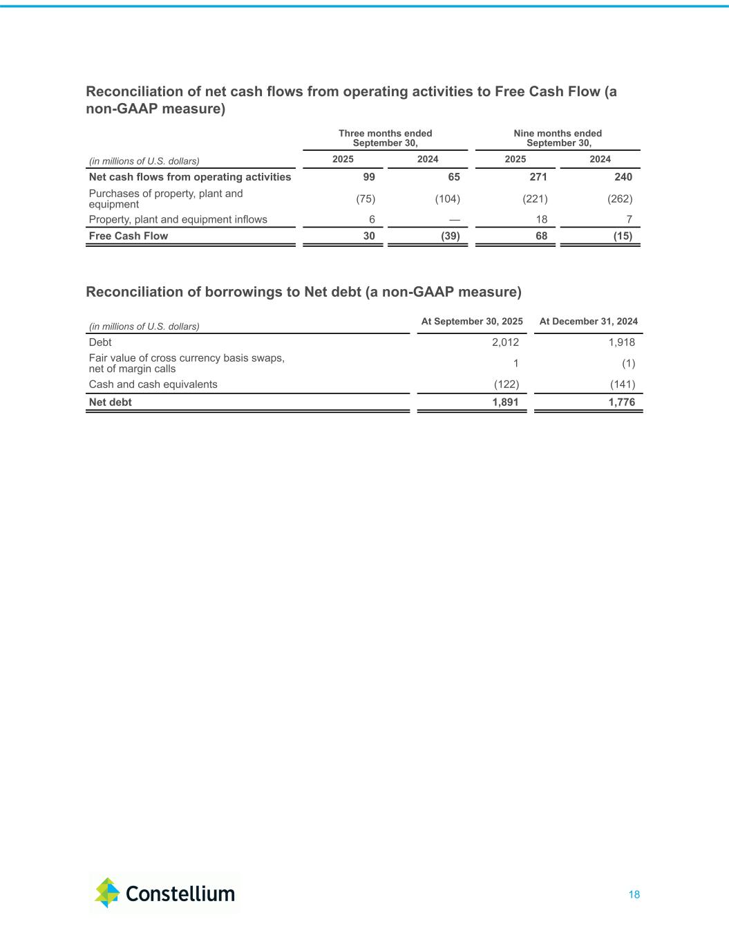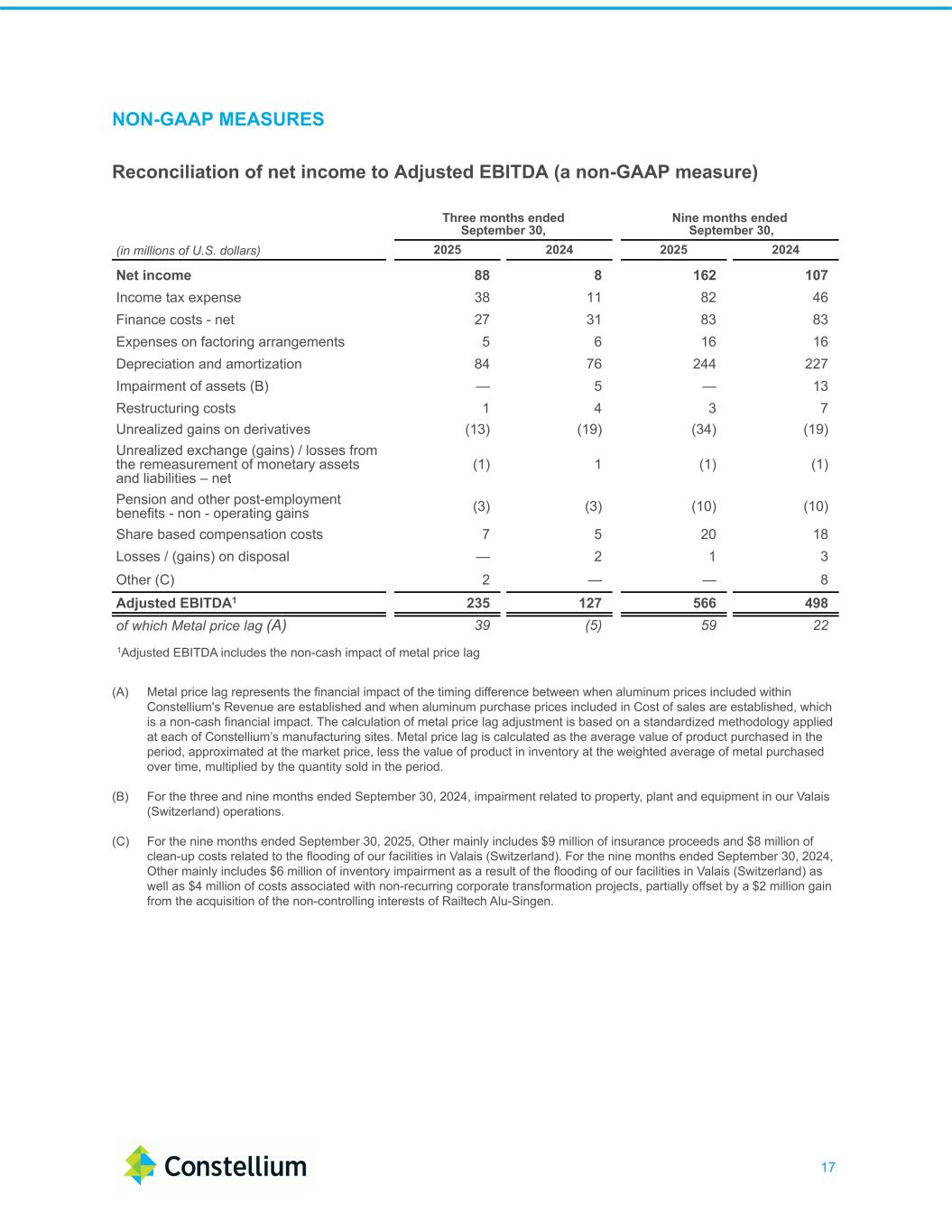 非美国通用会计准则计量净收入与调整后EBITDA的对账(非美国通用会计准则计量)截至9月30日的三个月,截至9月30日的九个月,(百万美元)2025202420252024净收入888162107所得税费用38118246财务成本-净额27318383保理安排费用561616折旧和摊销8476244227资产减值(b)— 5 — 13重组成本1437衍生工具未实现收益(13)(19)(34)(19)重新计量货币资产和负债产生的未实现汇兑(收益)/损失-净额(1)1(1)(1)养老金及其他离职后福利-非经营收益(3)(3)(10)(10)股份补偿成本752018处置损失/(收益)— 213其他(C)2 —— 8调整后EBITDA 1 235127566498其中金属价格滞后(A)39(5)59221调整后EBITDA包括金属价格滞后的非现金影响(A)金属价格滞后表示计入Constellium收入的铝价与计入销售成本的铝采购价格之间的时间差异所产生的财务影响,这是一种非现金财务影响。金属价格滞后调整的计算基于在Constellium的每个制造地点应用的标准化方法。金属价格滞后计算为该期间购买的产品的平均价值,近似于市场价格,减去随时间推移购买的金属的加权平均的库存产品价值,乘以该期间销售的数量。(b)截至2024年9月30日止三个月及九个月,与我们瓦莱州(瑞士)业务的物业、厂房及设备有关的减值。(c)截至2025年9月30日的九个月,其他主要包括900万美元的保险收益和800万美元与我们在瓦莱州(瑞士)的设施被洪水淹没有关的清理费用。截至2024年9月30日的九个月,其他主要包括由于我们在瓦莱州(瑞士)的设施被洪水淹没而产生的600万美元库存减值以及与非经常性公司转型项目相关的400万美元成本,部分被收购Railtech Alu-Singen非控股权益的200万美元收益所抵消。17