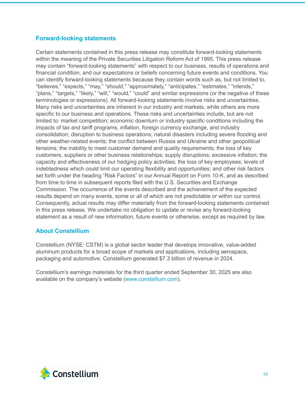 前瞻性陈述本新闻稿中包含的某些陈述可能构成1995年《私人证券诉讼改革法案》含义内的前瞻性陈述。本新闻稿可能包含有关我们的业务、经营业绩和财务状况的“前瞻性陈述”,以及我们对未来事件和状况的预期或信念。您可以识别前瞻性陈述,因为它们包含诸如但不限于“相信”、“预期”、“可能”、“应该”、“大约”、“预期”、“估计”、“打算”、“计划”、“目标”、“可能”、“将”、“将”、“可能”和类似表达(或这些术语或表达的否定)等词语。所有前瞻性陈述都涉及风险和不确定性。许多风险和不确定性是我们行业和市场固有的,而其他风险和不确定性则更具体到我们的业务和运营。这些风险和不确定性包括但不限于:市场竞争;经济下滑或行业特定情况,包括税收和关税计划、通货膨胀、外汇兑换和行业整合的影响;业务运营中断;自然灾害,包括严重的洪水和其他与天气有关的事件;俄罗斯和乌克兰之间的冲突以及其他地缘政治紧张局势;无法满足客户需求和质量要求;关键客户的流失,供应商或其他业务关系;供应中断;过度通胀;我们的对冲政策活动的能力和有效性;关键员工的流失;可能限制我们经营灵活性和机会的负债水平;以及我们的10-K表格年度报告中“风险因素”标题下列出的其他风险因素,以及在随后提交给美国证券交易委员会的报告中不时描述的其他风险因素。所述事件的发生和预期结果的实现取决于许多事件,其中部分或全部是不可预测的或在我们的控制范围内。因此,实际结果可能与本新闻稿中包含的前瞻性陈述存在重大差异。除法律要求外,我们不承担因新信息、未来事件或其他原因而更新或修改任何前瞻性陈述的义务。关于ConstelliumConstellium(纽约证券交易所代码:CSTM)是一家全球行业领先企业,为广泛的市场和应用开发创新的、具有附加值的铝产品,包括航空航天、包装和汽车。Constellium在2024年创造了73亿美元的收入。Constellium截至2025年9月30日的第三季度收益材料也可在该公司网站(www.constellium.com)上查阅。10