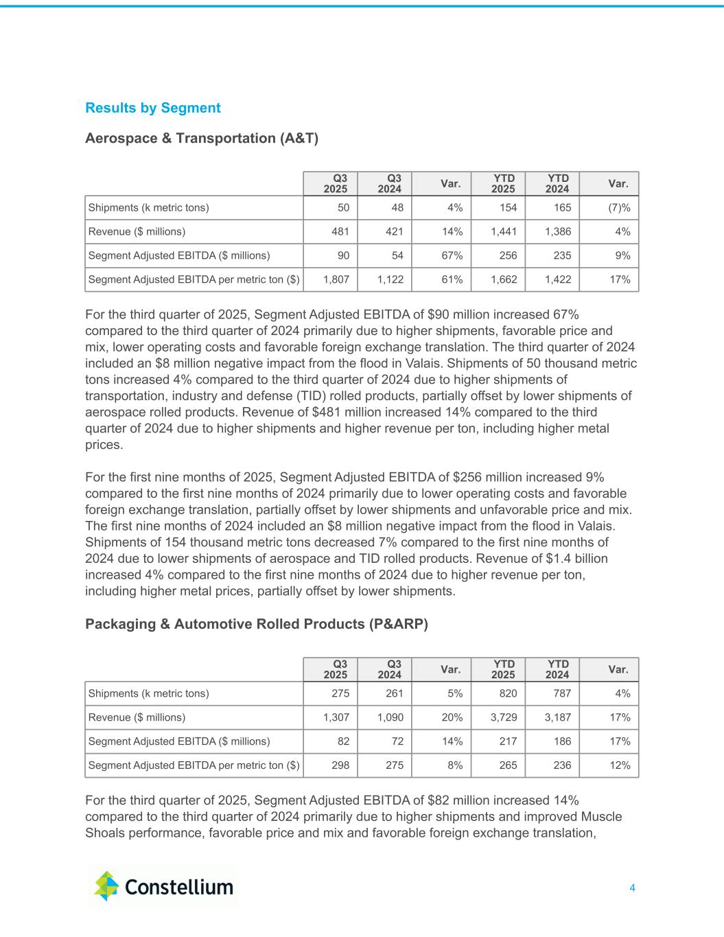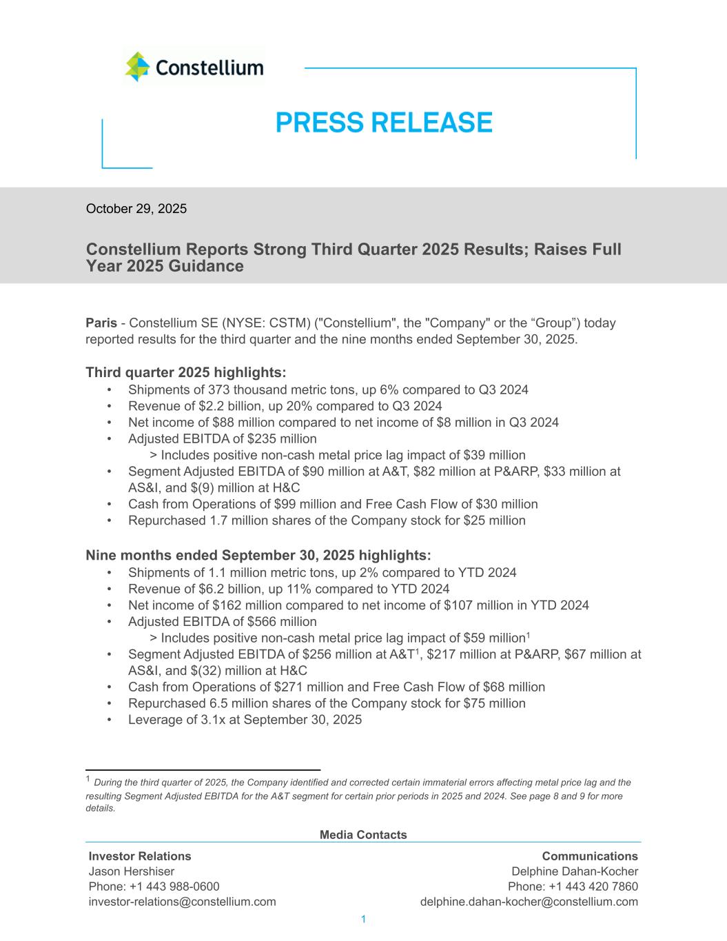 2025年10月29日Constellium公布强劲的2025年第三季度业绩;上调2025年全年指引Paris-Constellium SE(NYSE:CSTM)(“Constellium”,“公司”或“集团”)今天公布了第三季度和截至2025年9月30日止九个月的业绩。2025年第三季度亮点:•出货量为37.3万吨,较2024年第三季度增长6% •收入为22亿美元,较2024年第三季度增长20% •净收入为8800万美元,而2024年第三季度的净收入为800万美元•调整后EBITDA为2.35亿美元>包括3900万美元的积极非现金金属价格滞后影响• A & T部门调整后EBITDA为9000万美元,P & ARP为8200万美元,AS & I为3300万美元,和H & C的(9)百万美元•运营现金9900万美元,自由现金流3000万美元•以2500万美元回购170万股公司股票截至2025年9月30日的九个月亮点:•出货量为110万吨,与2024年年初至今相比增长2% •营收为62亿美元,与2024年年初至今相比增长11% •净收入为1.62亿美元,而2024年年初至今的净收入为1.07亿美元•调整后EBITDA为5.66亿美元>包括5900万美元的积极非现金金属价格滞后影响1 • A & T1部门调整后EBITDA为2.56亿美元,P & ARP为2.17亿美元,AS & I为6700万美元,H & C为(32)00万美元•运营现金为2.71亿美元,自由现金流为6800万美元•以7500万美元回购了650万股公司股票• 9月30日的杠杆为3.1倍,2025媒体联系投资者关系通讯Jason Hershiser Delphine Dahan-Kocher电话:+ 1443 988-0600电话:+ 14434207860 Investor-relations@constellium.com delphine.dahan-kocher@constellium.com 11在2025年第三季度,公司发现并更正了影响金属价格滞后的某些非实质性错误以及由此产生的A & T部门在2025年和2024年某些前期调整后的EBITDA。更多详情见第8和第9页。