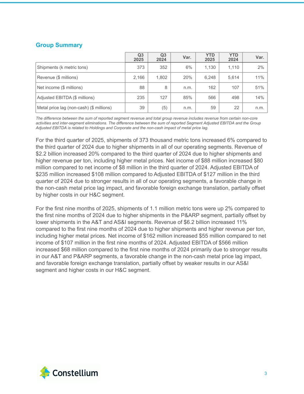 集团摘要Q3 2025 Q3 2024 var。2025年初至今2024年Var。出货量(k公吨)3733526% 1,1301,1102%收入(百万美元)2,1661,802 20% 6,2485,61411%净收入(百万美元)888 n.m. 16 2 10751%调整后EBITDA(百万美元)23512785% 56649814%金属价格滞后(非现金)(百万美元)39(5)n.m. 59 22 n.m。报告的分部收入总和与集团总收入之间的差额包括来自某些非核心活动的收入和分部间抵销。报告的分部调整后EBITDA和集团调整后EBITDA之和之间的差异与控股和企业以及金属价格滞后的非现金影响有关。由于我们所有运营部门的出货量增加,2025年第三季度的出货量为37.3万吨,与2024年第三季度相比增长了6%。营收22亿美元,与2024年第三季度相比增长20%,原因是出货量增加,每吨收入增加,包括金属价格上涨。净收入为8800万美元,与2024年第三季度的净收入800万美元相比,增加了8000万美元。调整后的EBITDA为2.35亿美元,与2024年第三季度的调整后EBITDA 1.27亿美元相比增加了1.08亿美元,原因是我们所有运营部门的业绩都更加强劲、非现金金属价格滞后影响的有利变化以及有利的外汇折算,但部分被我们H & C部门的成本增加所抵消。由于P & ARP部门的出货量增加,2025年前九个月的出货量为110万吨,与2024年前九个月相比增长了2%,但部分被A & T和AS & I部门的出货量下降所抵消。营收62亿美元,与2024年前9个月相比增长11%,原因是出货量增加,每吨收入增加,包括金属价格上涨。净收入为1.62亿美元,与2024年前9个月的净收入1.07亿美元相比,增加了5500万美元。调整后的EBITDA为5.66亿美元,与2024年前9个月相比增加了6800万美元,这主要是由于我们的A & T和P & ARP部门的业绩更加强劲、非现金金属价格滞后影响的有利变化以及有利的外汇折算,但部分被我们的AS & I部门的业绩疲软和H & C部门的成本增加所抵消。3