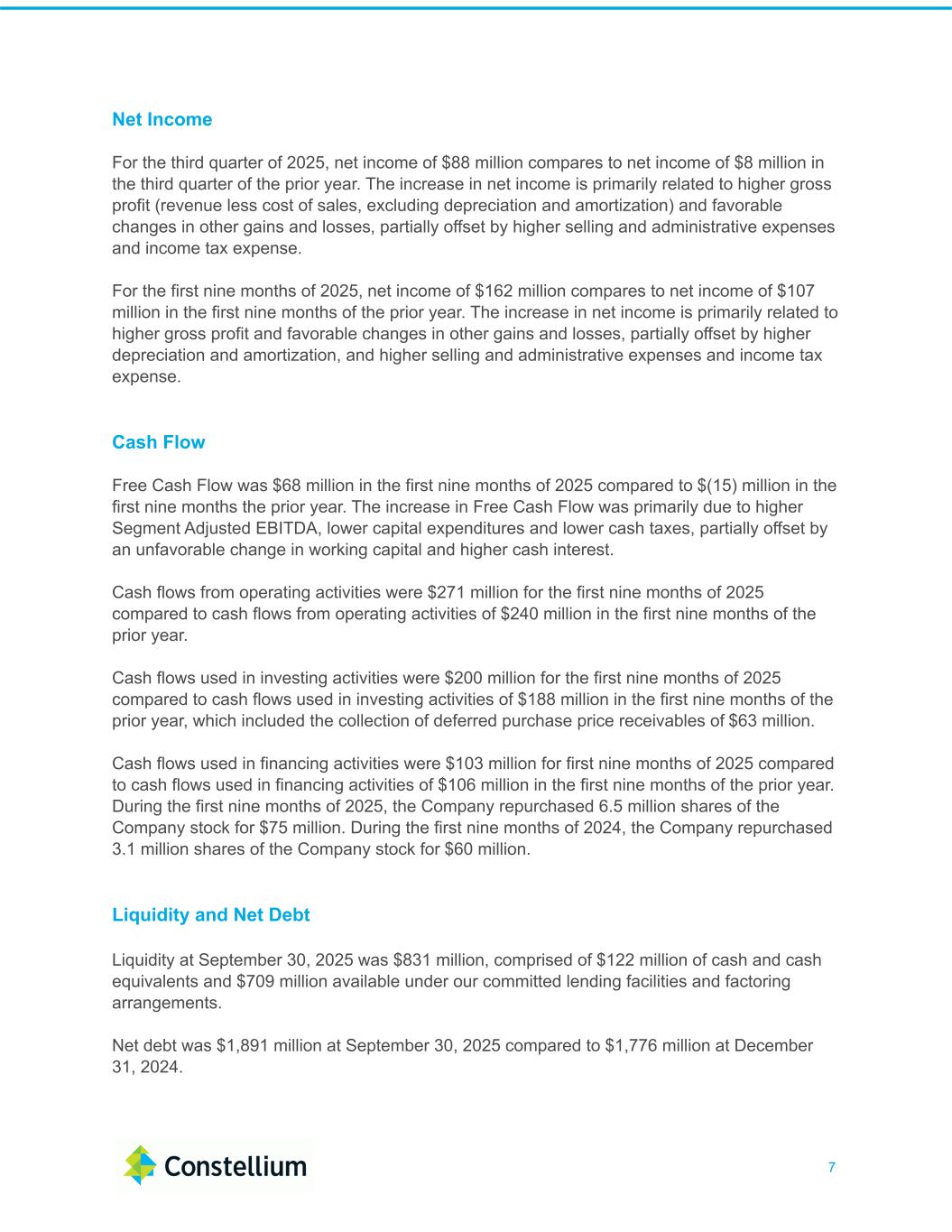 2025年第三季度的净收入,净收入为8800万美元,而去年第三季度的净收入为800万美元。净收入的增长主要与更高的毛利(收入减去销售成本,不包括折旧和摊销)和其他损益的有利变化有关,部分被更高的销售和管理费用以及所得税费用所抵消。2025年前9个月的净收入为1.62亿美元,而去年前9个月的净收入为1.07亿美元。净收入的增长主要与更高的毛利和其他损益的有利变化有关,部分被更高的折旧和摊销以及更高的销售和管理费用以及所得税费用所抵消。2025年前9个月的现金流自由现金流为6800万美元,而去年前9个月为(15)百万美元。自由现金流增加主要是由于分部调整后EBITDA增加、资本支出减少和现金税减少,部分被营运资本的不利变化和现金利息增加所抵消。2025年前9个月经营活动产生的现金流量为2.71亿美元,而上一年前9个月经营活动产生的现金流量为2.4亿美元。2025年前9个月用于投资活动的现金流量为2亿美元,而上一年前9个月用于投资活动的现金流量为1.88亿美元,其中包括收回6300万美元的递延购买价款应收款。2025年前9个月用于筹资活动的现金流量为1.03亿美元,而上一年前9个月用于筹资活动的现金流量为1.06亿美元。在2025年前九个月,该公司以7500万美元回购了650万股公司股票。在2024年前9个月,该公司以6000万美元回购了310万股公司股票。截至2025年9月30日,流动性和净债务流动性为8.31亿美元,包括1.22亿美元的现金和现金等价物,以及根据我们承诺的贷款便利和保理安排可用的7.09亿美元。截至2025年9月30日,净债务为18.91亿美元,而2024年12月31日为17.76亿美元。7