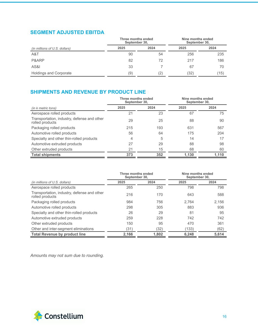 分部调整后EBITDA截至9月30日止三个月,截至9月30日止九个月,(百万美元)2025202420252024 A & T 9054256235 P & ARP 8272217186 AS & I 3376770控股和企业(9)(2)(32)(15)按产品线划分的出货量和收入截至9月30日止三个月,截至9月30日止九个月,(单位:k公吨)2025202420252024航空航天轧制产品21236775运输、工业、国防和其他轧制产品29258890包装轧制产品215193631567汽车轧制产品5664175204特种和其他薄轧制产品451417汽车挤压产品27298898其他挤压产品21156860总出货量3733521,1301,110截至9月30日的三个月,截至9月30日的九个月,(百万美元)2025202420252024航空航天轧制产品265250798798运输、工业、国防和其他轧制产品216170643588包装轧制产品9847562,7642,156汽车轧制产品298305883936特种和其他薄轧制产品26298195汽车挤压产品259228742742其他挤压产品15095470361其他和部门间抵销(31)(32)(133)(62)按产品线分列的总收入2,1661,8026,2485,614因四舍五入的关系,金额可能不相加。16