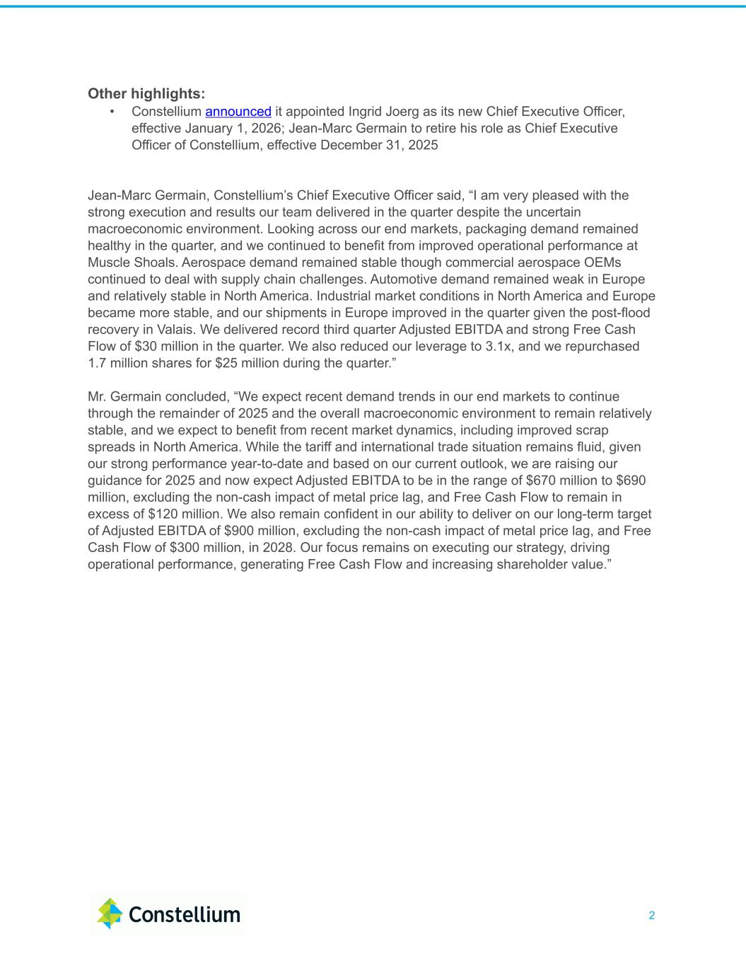其他亮点:• Constellium宣布任命Ingrid Joerg为新任首席执行官,自2026年1月1日起生效;让-马克·热尔曼(Jean-Marc Germain)辞去Constellium首席执行官的职务,自2025年12月31日起生效,Constellium的首席执行官让-马克·热尔曼(Jean-Marc Germain)表示:“尽管宏观经济环境不确定,但我对我们的团队在本季度交付的强大执行力和成果感到非常满意。纵观我们的终端市场,本季度包装需求保持健康,我们继续受益于Muscle Shoals运营业绩的改善。航空航天需求保持稳定,尽管商业航空航天原始设备制造商继续应对供应链挑战。欧洲汽车需求仍然疲软,北美相对稳定。北美和欧洲的工业市场状况变得更加稳定,鉴于瓦莱州洪水后的复苏,我们在欧洲的出货量在本季度有所改善。我们在本季度实现了创纪录的第三季度调整后EBITDA和3000万美元的强劲自由现金流。我们还将杠杆率降至3.1倍,本季度我们以2500万美元回购了170万股。”Germain先生总结道:“我们预计终端市场近期的需求趋势将持续到2025年剩余时间,整体宏观经济环境将保持相对稳定,我们预计将受益于近期的市场动态,包括北美废钢价差的改善。尽管关税和国际贸易局势仍然不稳定,但鉴于我们年初至今的强劲表现并基于我们目前的展望,我们正在上调2025年的指引,现在预计调整后EBITDA将在6.7亿美元至6.9亿美元之间,不包括金属价格滞后的非现金影响,自由现金流将保持在1.2亿美元以上。我们还对我们在2028年实现调整后EBITDA 9亿美元(不包括金属价格滞后的非现金影响)和自由现金流3亿美元的长期目标的能力充满信心。我们的重点仍然是执行我们的战略、推动运营业绩、产生自由现金流和增加股东价值。”2