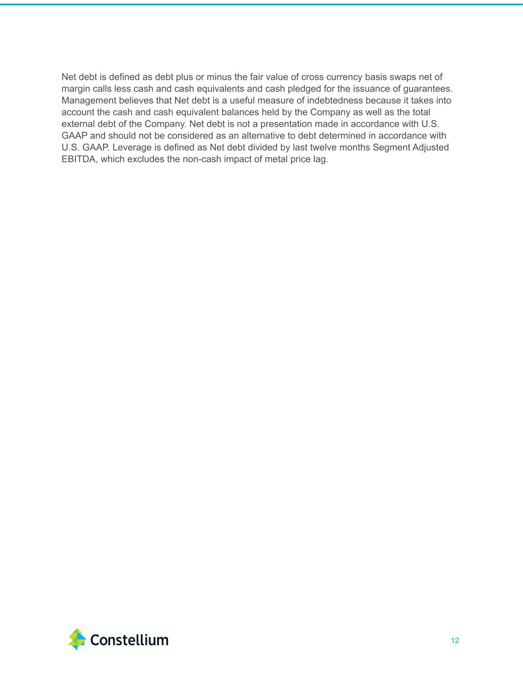 净债务定义为债务加上或减去交叉货币基差掉期的公允价值扣除追加保证金后减去现金和现金等价物以及为发行担保而质押的现金。管理层认为,净负债是衡量负债的有用指标,因为它考虑了公司持有的现金和现金等价物余额以及公司的外债总额。净债务不是根据美国公认会计原则作出的列报,不应被视为替代根据美国公认会计原则确定的债务。杠杆定义为净债务除以过去十二个月的分部调整后EBITDA,其中排除了金属价格滞后的非现金影响。12