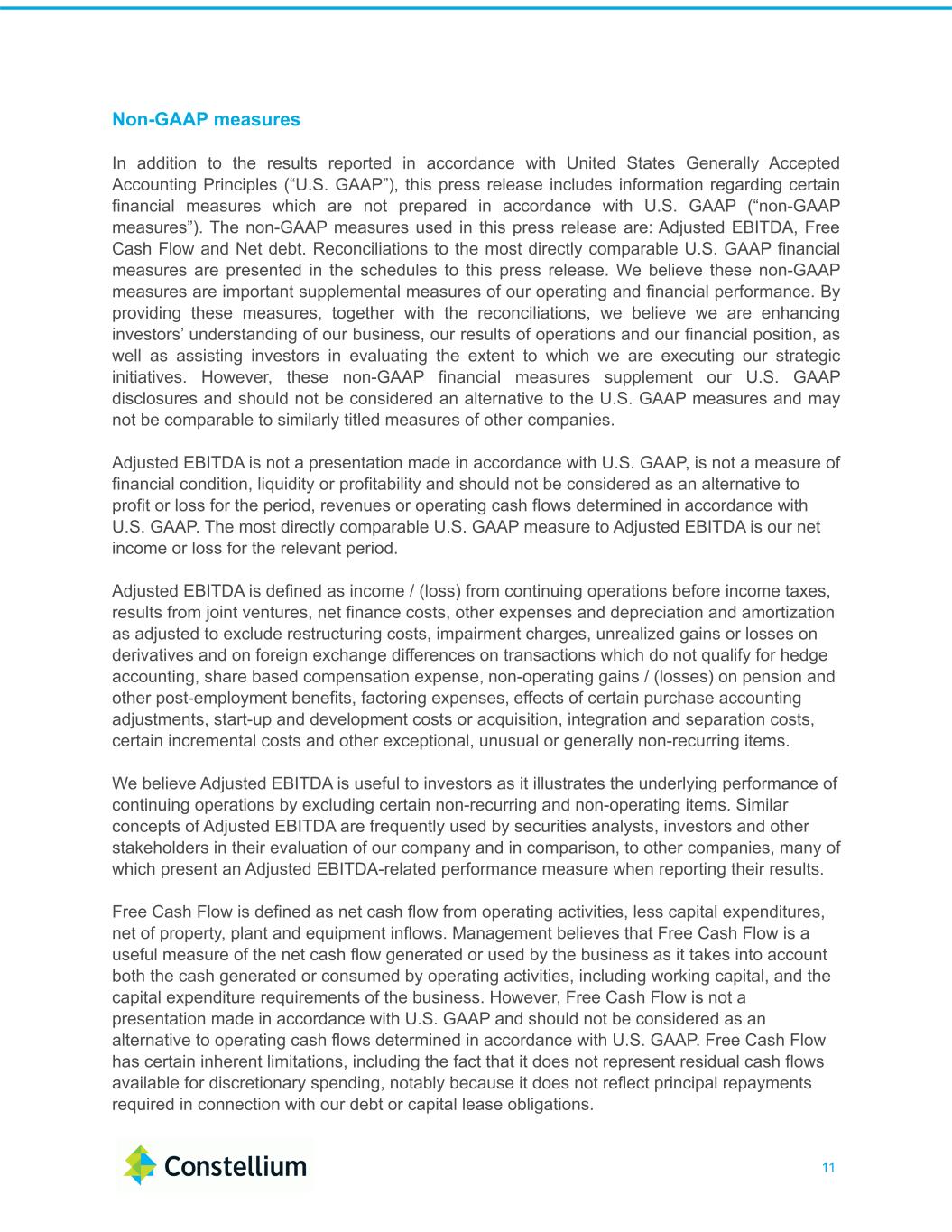 非GAAP措施除了根据美国公认会计原则(“U.S. GAAP”)报告的结果外,本新闻稿还包括有关某些未根据美国公认会计原则(“非GAAP措施”)编制的财务措施的信息。本新闻稿中使用的非GAAP衡量标准是:调整后EBITDA、自由现金流和净债务。与最直接可比的美国公认会计原则财务指标的对账在本新闻稿的时间表中列出。我们认为,这些非公认会计原则措施是我们经营和财务业绩的重要补充措施。通过提供这些措施,连同对账,我们相信我们正在加强投资者对我们的业务、我们的经营业绩和我们的财务状况的了解,并协助投资者评估我们执行战略举措的程度。然而,这些非GAAP财务指标补充了我们的美国GAAP披露,不应被视为美国GAAP指标的替代方案,可能无法与其他公司的类似名称的指标进行比较。调整后EBITDA不是根据美国公认会计原则作出的列报,不是财务状况、流动性或盈利能力的衡量标准,不应被视为期间损益、收入或根据美国公认会计原则确定的经营现金流的替代方案。与调整后EBITDA最直接可比的美国公认会计原则衡量标准是我们在相关期间的净收入或亏损。调整后EBITDA定义为持续经营业务的所得税前收入/(亏损)、合营企业产生的结果、净财务成本、其他费用以及经调整的折旧和摊销,不包括重组成本、减值费用、衍生工具的未实现损益和不符合套期会计条件的交易的外汇差额、基于股份的补偿费用、养老金和其他离职后福利的非经营性收益/(亏损)、保理费用、某些采购会计调整的影响、开办和开发成本或收购、整合和离职成本、某些增量成本和其他特殊、不寻常或一般非经常性项目。我们认为调整后的EBITDA对投资者有用,因为它通过排除某些非经常性和非经营性项目来说明持续经营的基本表现。与其他公司相比,证券分析师、投资者和其他利益相关者在评估我们公司时经常使用调整后EBITDA的类似概念,其中许多公司在报告业绩时提出了调整后EBITDA相关的业绩衡量标准。自由现金流定义为经营活动产生的净现金流,减去资本支出,扣除物业、厂房和设备流入。管理层认为,自由现金流是衡量企业产生或使用的净现金流的有用指标,因为它同时考虑了经营活动产生或消耗的现金,包括营运资金,以及企业的资本支出需求。然而,自由现金流不是根据美国公认会计原则作出的列报,不应被视为替代根据美国公认会计原则确定的经营现金流。自由现金流具有某些固有的局限性,包括它不代表可用于可自由支配支出的剩余现金流,主要是因为它不反映与我们的债务或资本租赁义务相关的所需本金偿还。11