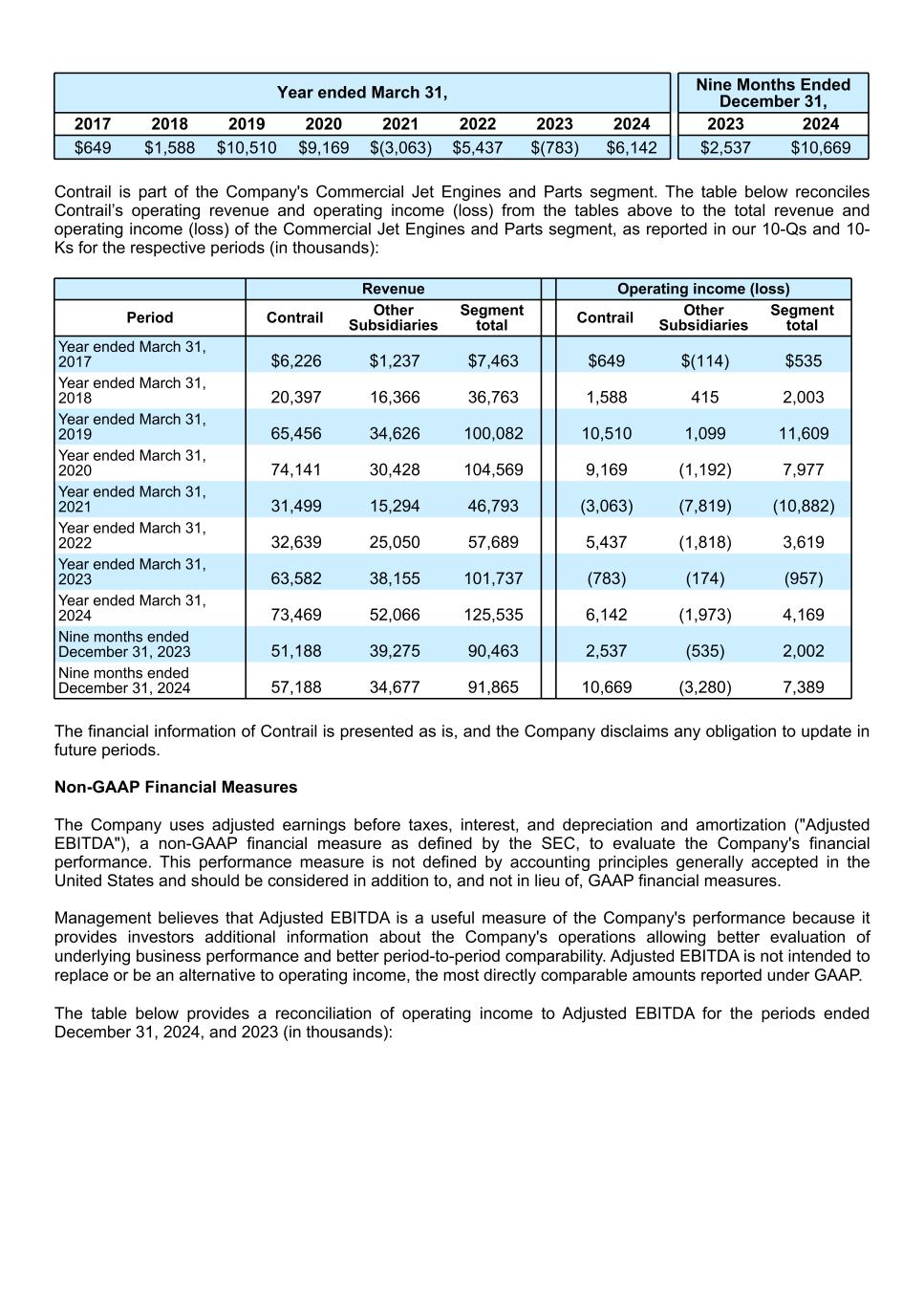 截至3月31日止年度截至2017年12月31日止九个月2018201920202021202220232023202420232024 $ 649 $ 1,588 $ 10,510 $ 9,169 $(3,063)$ 5,437 $(783)$ 6,142 $ 2,537 $ 10,669 Contrail是公司商用喷气发动机和零部件部门的一部分。下表将上表中Contrail的营业收入和营业收入(亏损)与商用喷气发动机和零部件部门的总收入和营业收入(亏损)进行了核对,如我们在各自期间的10-Qs和10-Ks中所报告的(以千为单位):收入营业收入(亏损)期间Contrail其他子公司部门总额Contrail其他子公司部门总额截至2017年3月31日止年度6,226美元1,237美元7,463美元649美元(114)535美元截至2018年3月31日止年度20,39716,36636,7631,5884152,003截至2019年3月31日止年度65,45634,626100,08210,5101,09911,609截至3月31日止年度,202074,14130,428104,5699,169(1,192)7,977截至2021年3月31日止年度31,49915,29446,793(3,063)(7,819)(10,882)截至2022年3月31日止年度32,63925,05057,6895,437(1,818)3,619截至2023年3月31日止年度63,58238,155101,737(783)(174)(957)截至2024年3月31日止年度73,46952,066125,5356,142(1,973)4,169截至2023年12月31日止九个月51,18839,27590,4632,537(535)2,002截至2024年12月31日止九个月57,18834,67791,86510,669非美国通用会计准则财务指标公司使用调整后的税前利润、利息、折旧和摊销前利润(“调整后EBITDA”),这是美国证券交易委员会定义的非美国通用会计准则财务指标,用于评估公司的财务业绩。美国普遍接受的会计原则没有对这一业绩衡量标准进行定义,应将其作为GAAP财务衡量标准的补充,而不是代替。管理层认为,调整后的EBITDA是衡量公司业绩的有用指标,因为它为投资者提供了有关公司运营的额外信息,从而可以更好地评估基础业务业绩和更好的期间可比性。调整后的EBITDA无意取代或替代营业收入,这是根据公认会计原则报告的最直接可比金额。下表提供了截至2024年12月31日和2023年12月31日期间营业收入与调整后EBITDA的对账(单位:千):