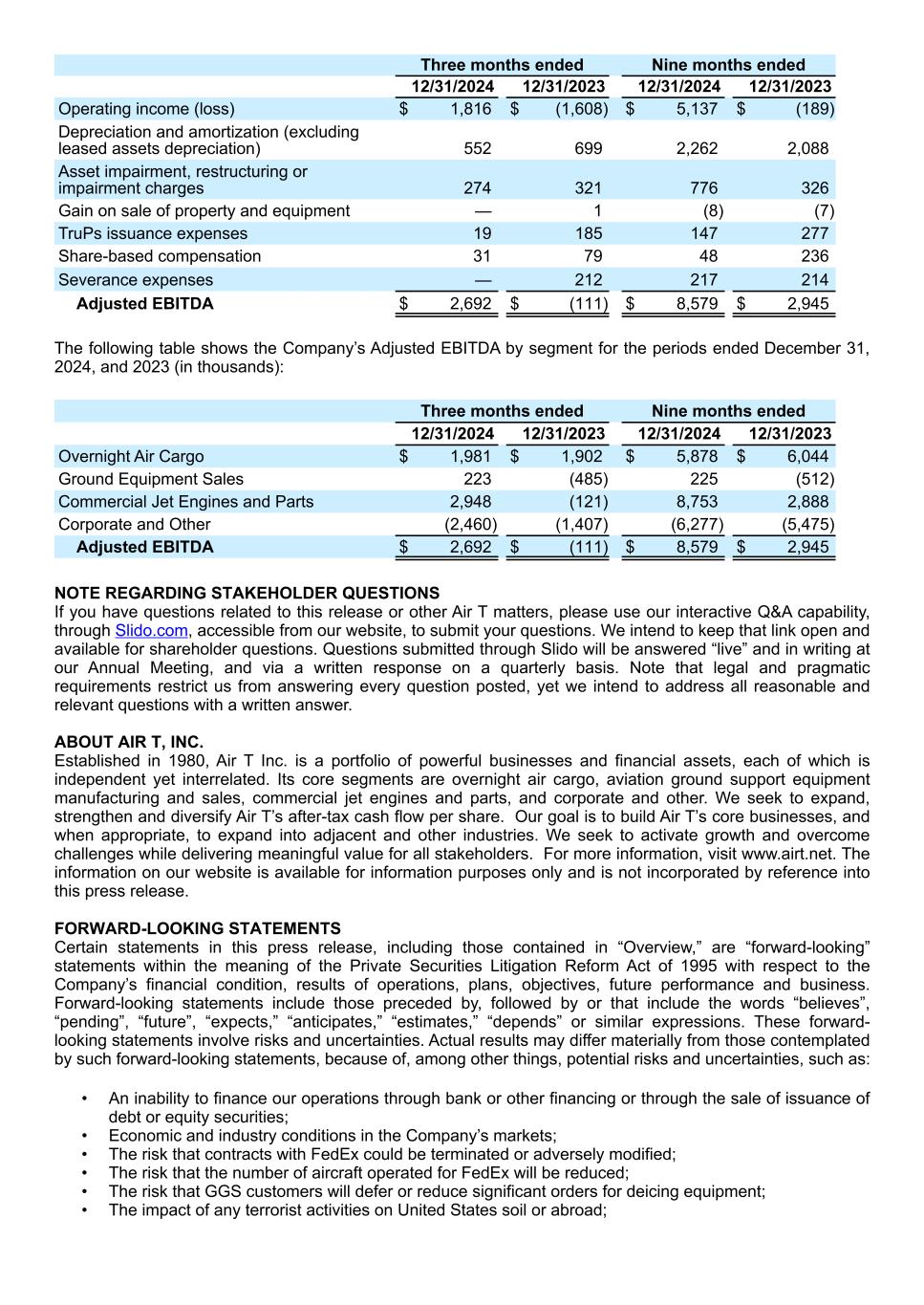 截至12/31/202412/31/202312/31/202412/31/2023营业收入(亏损)$ 1,816 $(1,608)$ 5,137 $(189)折旧和摊销(不包括租赁资产折旧)5526992,2622,088资产减值、重组或减值费用274321776326出售财产和设备收益— 1(8)(7)TruPs发行费用19185147277股份补偿317948236遣散费— 212217214调整后EBITDA 2,692美元(111)8,579美元2,945美元下表显示公司截至2024年12月31日止期间按分部划分的调整后EBITDA,2023(单位:千):截至12/31/2024止九个月的三个月12/31/202312/31/202412/31/2023隔夜航空货运$ 1,981 $ 1,902 $ 5,878 $ 6,044地面设备销售223(485)225(512)商用喷气发动机和零部件2,948(121)8,7532,888公司和其他(2,460)(1,407)(6,277)(5,475)调整后EBITDA $ 2,692 $(111)$ 8,579 $ 2,945有关利益相关者问题的说明如果您对本新闻稿或其他Air T事项有任何相关问题,请使用我们的互动问答能力,通过Slido.com,可从我们的网站访问,提交您的问题。我们打算保持该链接的开放性,并可供股东提问。通过Slido提交的问题将在我们的年度会议上以“现场”和书面形式得到答复,并每季度通过书面答复得到答复。注意,法律和务实的要求限制了我们回答每一个发布的问题,但我们打算用书面回答解决所有合理和相关的问题。关于AIR T,INC。Air T Inc.成立于1980年,是一个由强大的业务和金融资产组成的投资组合,每一项业务都是独立的,但又相互关联。其核心板块为隔夜航空货运、航空地面保障设备制造与销售、商用喷气发动机及零部件、企业及其他。我们寻求做大做强并多元化Air T的每股税后现金流。我们的目标是打造Air T的核心业务,并在适当的时候向毗邻的行业和其他行业进行扩张。我们寻求激活增长并克服挑战,同时为所有利益相关者提供有意义的价值。欲了解更多信息,请访问www.airt.net。我们网站上的信息仅供参考,不以引用方式并入本新闻稿。前瞻性陈述本新闻稿中的某些陈述,包括“概述”中包含的陈述,是1995年《私人证券诉讼改革法案》含义内关于公司财务状况、运营结果、计划、目标、未来业绩和业务的“前瞻性”陈述。前瞻性陈述包括前面、后面或包含“相信”、“未决”、“未来”、“预期”、“预期”、“估计”、“取决于”或类似表述的陈述。这些前瞻性陈述涉及风险和不确定性。由于潜在风险和不确定性等因素,实际结果可能与此类前瞻性陈述所设想的结果存在重大差异,例如:•无法通过银行或其他融资或通过出售发行债务或股本证券为我们的运营提供资金;•公司市场的经济和行业状况;•与联邦快递的合同可能被终止或不利修改的风险;•为联邦快递运营的飞机数量减少的风险;• GGS客户推迟或减少大量除冰设备订单的风险;•任何恐怖活动对美国本土或国外的影响;