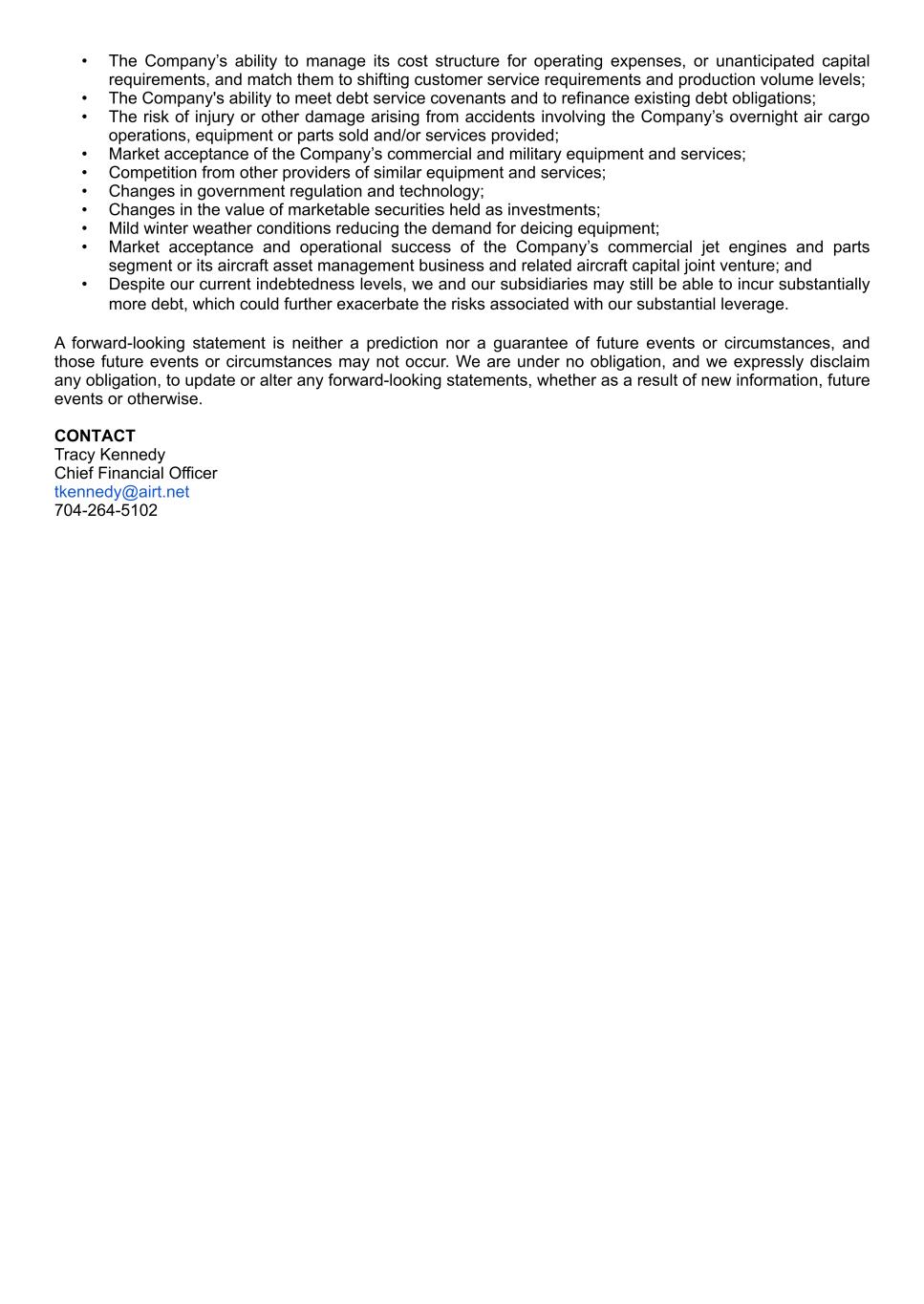 •公司对运营费用或意外资本需求的成本结构进行管理的能力,并将其与不断变化的客户服务要求和生产量水平相匹配;•公司满足偿债契约和为现有债务债务再融资的能力;•涉及公司通宵航空货运业务的事故造成的伤害或其他损害的风险,出售的设备或零部件和/或提供的服务;•公司商业和军事设备及服务的市场接受度;•来自其他类似设备和服务提供商的竞争;•政府法规和技术的变化;•作为投资持有的有价证券的价值变化;•冬季气候条件温和,减少了对除冰设备的需求;•公司的商用喷气式发动机和零部件部门或其飞机资产管理业务和相关飞机资本合资企业的市场接受度和运营成功;•尽管我们目前的负债水平,我们和我们的子公司可能仍然能够承担更多的债务,这可能会进一步加剧与我们的大幅杠杆相关的风险。前瞻性陈述既不是对未来事件或情况的预测,也不是对未来事件或情况的保证,这些未来事件或情况可能不会发生。我们没有义务,而且我们明确表示不承担任何义务,更新或更改任何前瞻性陈述,无论是由于新信息、未来事件或其他原因。联系人Tracy Kennedy 首席财务官 tkennedy @ airt.net 704-264-5102