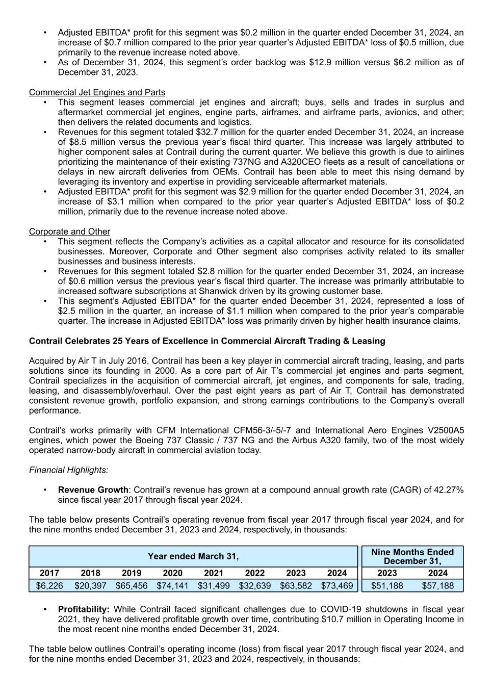 •调整后EBITDA*截至2024年12月31日的季度,该部门的利润为20万美元,与去年同期的调整后EBITDA相比增加了70万美元*亏损50万美元,主要是由于上述收入增加。•截至2024年12月31日,该部门的订单积压为1290万美元,而截至2023年12月31日为620万美元。商用喷气发动机和零部件•该分部租赁商用喷气发动机和飞机;购买、销售和交易剩余和售后市场的商用喷气发动机、发动机零部件、机身、机身零部件、航空电子设备和其他;然后交付相关文件和物流。•截至2024年12月31日的季度,该部门的收入总计3270万美元,与上一财年第三季度相比增加了850万美元。这一增长主要归因于本季度Contrail的组件销售额增加。我们认为,这一增长是由于航空公司优先维护其现有的737NG和A320CEO机队,因为主机厂的新飞机交付被取消或延迟。Contrail已经能够通过利用其库存和专业知识来提供可服务的售后市场材料来满足这种不断增长的需求。•调整后EBITDA*截至2024年12月31日的季度,该部门的利润为290万美元,与去年同期的调整后EBITDA相比增加了310万美元*亏损20万美元,主要是由于上述收入增加。企业和其他•这一部分反映了公司作为资本分配者和合并业务资源的活动。此外,企业和其他部门还包括与其较小的业务和商业利益相关的活动。•截至2024年12月31日的季度,该部门的收入总计280万美元,与上一财年第三季度相比增加了60万美元。这一增长主要是由于不断增长的客户群推动了山威软件订阅量的增加。•该部门的调整后EBITDA*截至2024年12月31日的季度,该季度亏损250万美元,与去年同期相比增加110万美元。调整后EBITDA的增加*造成损失的主要原因是医疗保险索赔增加。Contrail庆祝商用飞机贸易&租赁卓越25周年于2016年7月被Air T收购,自2000年成立以来,Contrail一直是商用飞机贸易、租赁和零部件解决方案的关键参与者。作为Air T商用喷气式发动机及零部件板块的核心零部件,康泰瑞专业从事商用飞机、喷气式发动机、零部件的收购、销售、贸易、租赁、拆解/大修等业务。作为Air T的一部分,过去八年来,Contrail表现出持续的收入增长、投资组合扩张以及对公司整体业绩的强劲盈利贡献。Contrail主要与CFM International CFM56-3/-5/-7和International Aero Engines V2500A5发动机合作,后者为波音737 Classic/737 NG和空客A320系列提供动力,这两款机型是当今商业航空领域运营最广泛的窄体飞机。财务亮点:•收入增长:自2017财年至2024财年,Contrail的收入以42.27%的复合年增长率(CAGR)增长。下表列出了Contrail从2017财年到2024财年,以及截至2023年12月31日和2024年12月31日止九个月的营业收入,单位:千:截至3月31日止年度,截至2017年12月31日止九个月2018201920202021202220232023202420232024美元6,226美元20,397美元65,456美元74,141美元31,499美元32,639美元63,582美元73,469美元51,188美元57,188美元•盈利能力:虽然Contrail在2021财年因新冠疫情停工而面临重大挑战,但随着时间的推移,它们实现了盈利增长,在截至2024年12月31日的最近九个月贡献了1070万美元的营业收入。下表分别概述了Contrail从2017财年到2024财年,以及截至2023年12月31日和2024年12月31日止九个月的营业收入(亏损),单位为千: