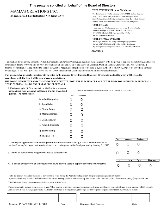 诚邀您参加内华达州公司Mama’s Creations,Inc.(连同其子公司,“公司”、“Mama’s Creations”、“我们”、“我们”或“我们的”)将于2024年7月3日东部时间下午12:00举行的股东年会(“年会”)。年会将是一场虚拟会议,将通过拨打877-407-3088(免费电话)作为只听电话会议举行。不会有实体会议地点。如果您在会议日遇到虚拟会议平台的任何技术难题,请致电877-804-2062(免费电话)或发送电子邮件至proxy@equitystock.com会议的召开目的如下: