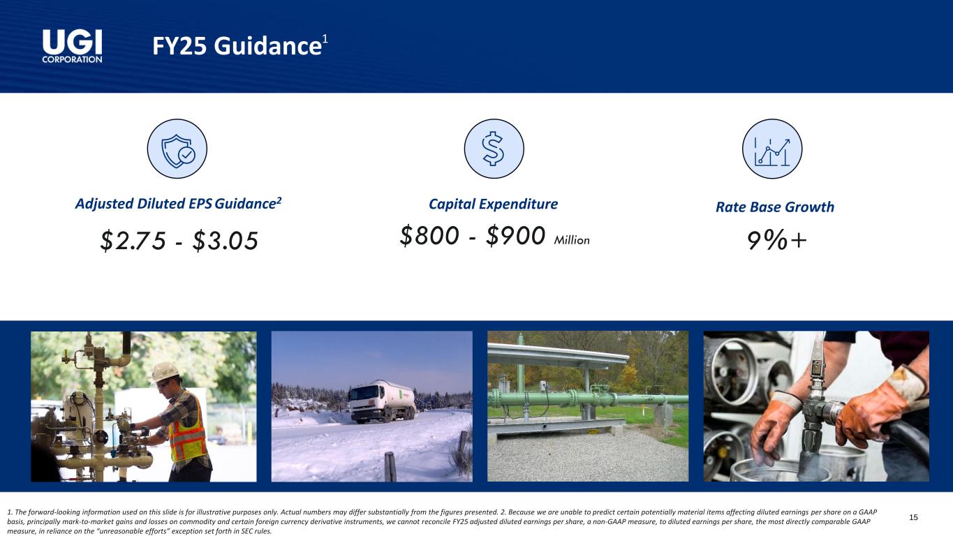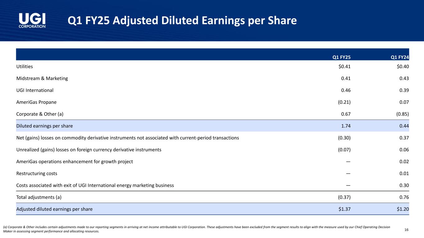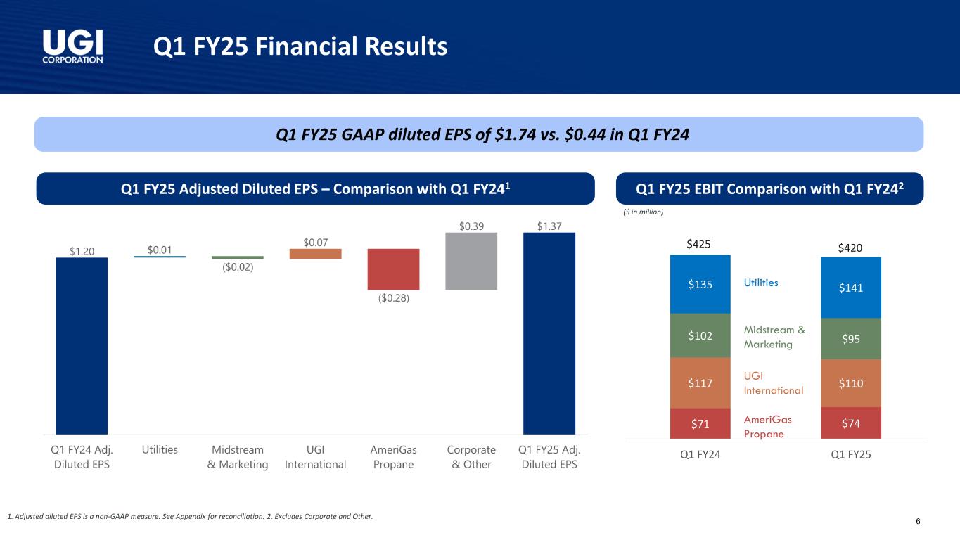 25财年第一季度亮点调整后稀释后每股收益1财年第一季度GAAP摊薄后每股收益为1.74美元,而24财年第一季度为0.44美元1.20美元1.37美元24财年第一季度25财年第一季度1。调整后的稀释后每股收益是一种非公认会计准则衡量标准。调节见附录。2.包括对权益法被投资方的投资。丨经调整摊薄后每股收益增长14%,这得益于稳健的业务表现和我们税收优化战略的受益丨天然气-强劲的天然气需求和Mountaineer更高的气价,我们的西弗吉尼亚州天然气公用事业丨全球液化石油气-固体液化石油气的销量以及较低的运营和管理费用丨有纪律的资本配置推动长期增长丨2.36亿美元2的资本支出,84%投资于天然气业务丨持续的客户增加和专注于提供卓越的客户服务o在公用事业公司增加了4,000多家客户o UGI公用事业公司被公认为Cogent 2024公用事业客户冠军丨通过Pine Run Gathering(由UGI美国能源服务拥有49%股权)收购Superior Appalachian,后者在宾夕法尼亚州拥有并运营3个收集系统,以1.2亿美元融资;该交易的融资完全来自Pine Run Gathering的债务丨实现了多个RNG设施的实质性完工,这些设施分别是MBL Bioenergy-Brookings和Lakeside,以及Cayuga-Bergen农场。在满负荷生产时,这些设施将有能力从乳制品原料中生产650 + MMCF的RNG丨向宾夕法尼亚州公用事业委员会提交的用于UGI公用事业的备案气体基准费率案例,要求提高总体分配费率约1.1亿美元4