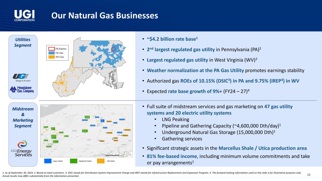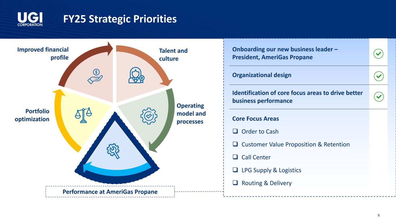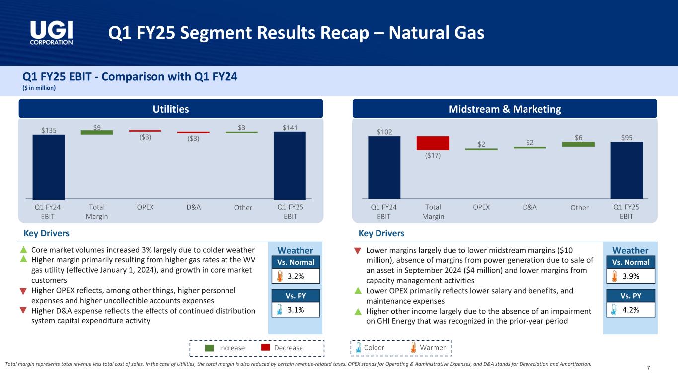 25财年第一季度亮点调整后稀释后每股收益1财年第一季度GAAP摊薄后每股收益为1.74美元,而24财年第一季度为0.44美元1.20美元1.37美元24财年第一季度25财年第一季度1。调整后的稀释后每股收益是一种非公认会计准则衡量标准。调节见附录。2.包括对权益法被投资方的投资。丨经调整摊薄后每股收益增长14%,这得益于稳健的业务表现和我们税收优化战略的受益丨天然气-强劲的天然气需求和Mountaineer更高的气价,我们的西弗吉尼亚州天然气公用事业丨全球液化石油气-固体液化石油气的销量以及较低的运营和管理费用丨有纪律的资本配置推动长期增长丨2.36亿美元2的资本支出,84%投资于天然气业务丨持续的客户增加和专注于提供卓越的客户服务o在公用事业公司增加了4,000多家客户o UGI公用事业公司被公认为Cogent 2024公用事业客户冠军丨通过Pine Run Gathering(由UGI美国能源服务拥有49%股权)收购Superior Appalachian,后者在宾夕法尼亚州拥有并运营3个收集系统,以1.2亿美元融资;该交易的融资完全来自Pine Run Gathering的债务丨实现了多个RNG设施的实质性完工,这些设施分别是MBL Bioenergy-Brookings和Lakeside,以及Cayuga-Bergen农场。在满负荷生产时,这些设施将有能力从乳制品原料中生产650 + MMCF的RNG丨向宾夕法尼亚州公用事业委员会提交的用于UGI公用事业的备案气体基准费率案例,要求提高总体分配费率约1.1亿美元4