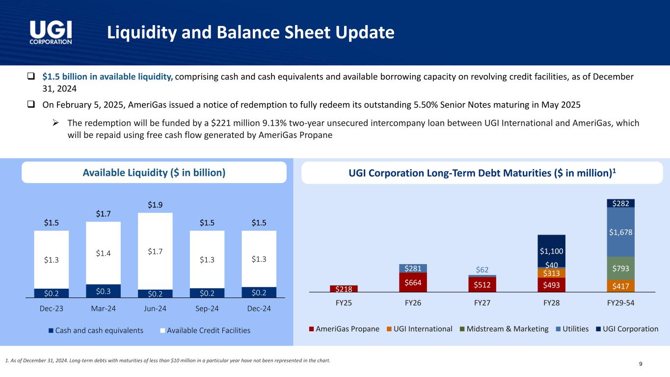 流动性和资产负债表更新1。截至2024年12月31日。图表中未显示特定年份到期日低于1000万美元的长期债务。丨截至2024年12月31日,可用流动资金为15亿美元,包括现金和现金等价物以及循环信贷额度的可用借款能力丨2025年2月5日,AmeriGas发布赎回通知,全额赎回其于2025年5月到期的未偿还的5.50%优先票据丨赎回资金将来自UGI国际与AmeriGas之间的2.21亿美元、利率为9.13%的两年期无担保公司间贷款,将使用AmeriGas Propane UGI Corporation长期债务到期产生的自由现金流偿还(百万美元)1可用流动性(十亿美元)0.2美元0.3美元0.2美元0.2美元0.2美元0.2美元0.2美元1.3美元1.4美元1.7美元1.3美元1.3美元1.5美元1.5美元1.7美元1.5美元1.5美元1.5美元1.5美元12月23日3月24日6月24日9月24日12月24日12月24日现金和现金等价物可用信贷便利9美元218美元664美元512美元493美元313美元417美元793美元281美元62美元40美元1,678美元1,100美元282美元25财年26财年27财年28财年29-54美元AmeriGas Propane UGI International Midstream & Marketing Utilities UGI Corporation