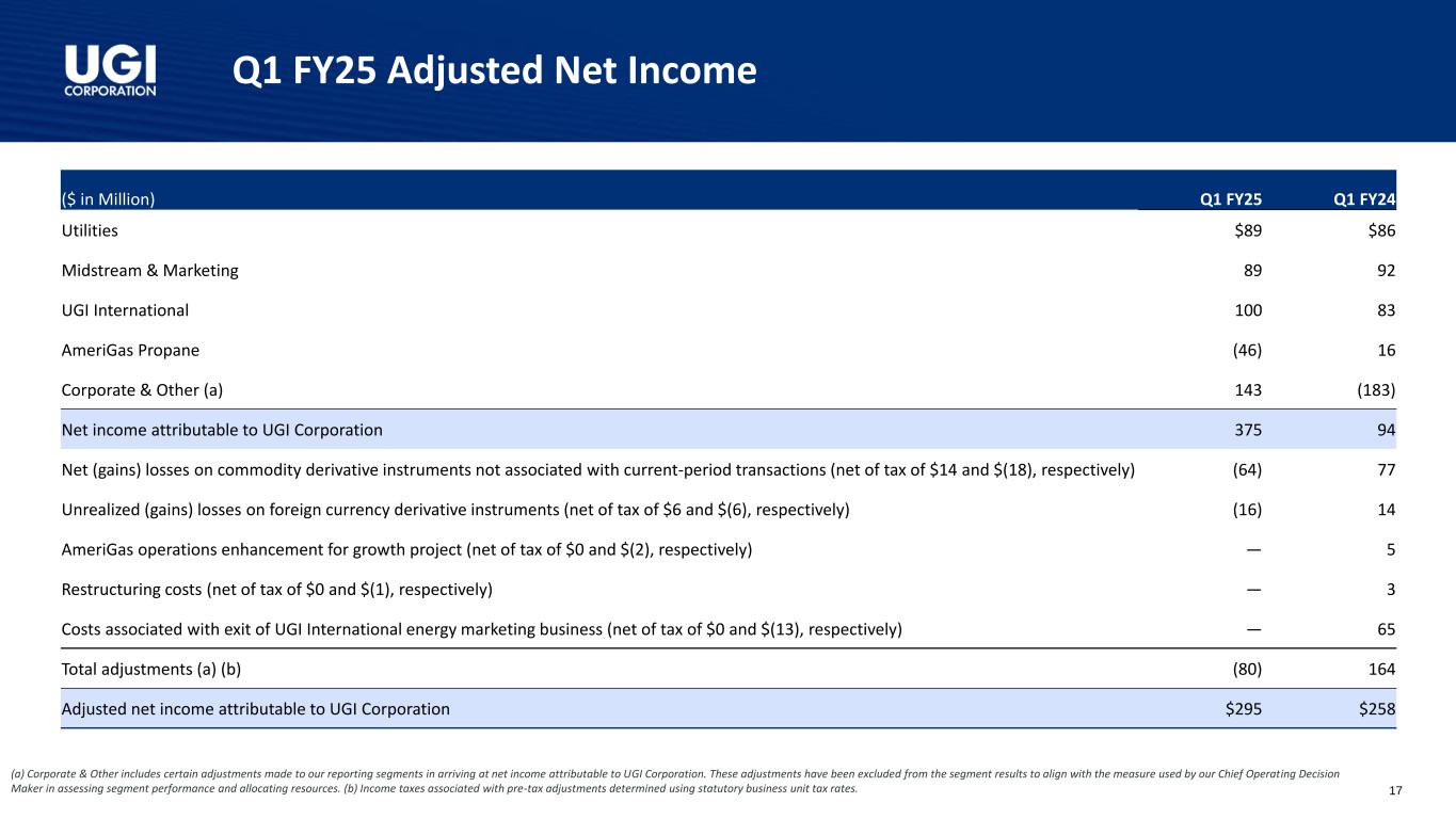 25财年第一季度调整后稀释每股收益(a)公司及其他包括在得出归属于UGI公司的净利润时对我们的报告分部所做的某些调整。这些调整已被排除在分部业绩之外,以与我们的首席运营决策者在评估分部业绩和分配资源时使用的衡量标准保持一致。16 Q1 FY25 Q1 FY24 Utilities $ 0.41 $ 0.40 Midstream & Marketing 0.4 10.43 UGI International 0.46 0.39 AmeriGas Propane(0.21)0.07 Corporate & Other(a)0.67(0.85)稀释每股收益1.74 0.44与当期交易无关的商品衍生工具净(收益)亏损(0.30)0.37外币衍生工具未实现(收益)亏损(0.07)0.06 AmeriGas为增长而增强运营项目— 0.02重组成本— 0.01与退出UGI国际能源营销业务相关的成本— 0.30总调整(a)(0.37)0.76调整后稀释每股收益1.37美元1.20美元