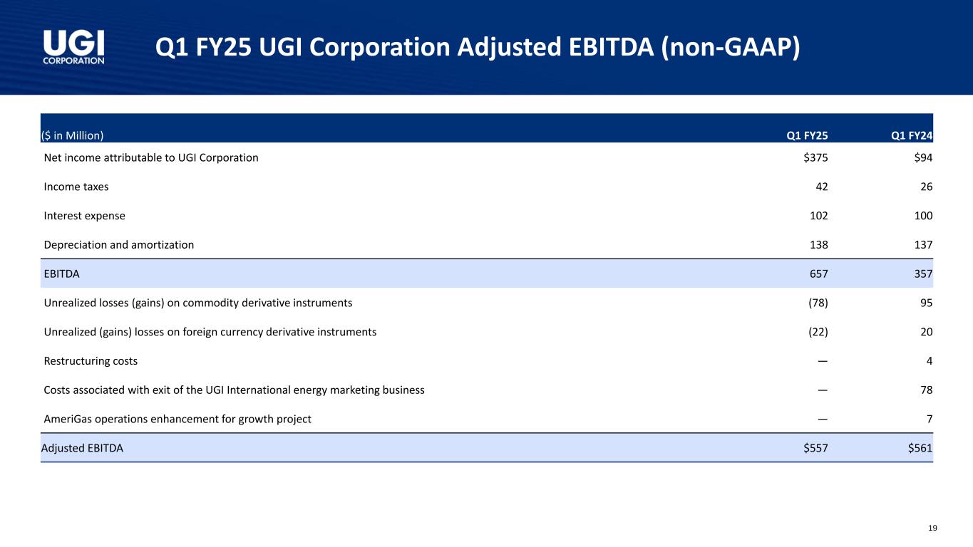 25财年第一季度UGI公司调整后EBITDA(非GAAP)19(百万美元)25财年第一季度24财年第一季度归属于UGI公司的净利润375美元94美元所得税4226利息费用102100折旧和摊销138137 EBITDA 657357商品衍生工具未实现损失(收益)(78)95外币衍生工具未实现(收益)损失(22)20重组成本— 4与退出UGI国际能源营销业务相关的成本— 78 AmeriGas增强运营以促进增长项目— 7调整后EBITDA 557美元561