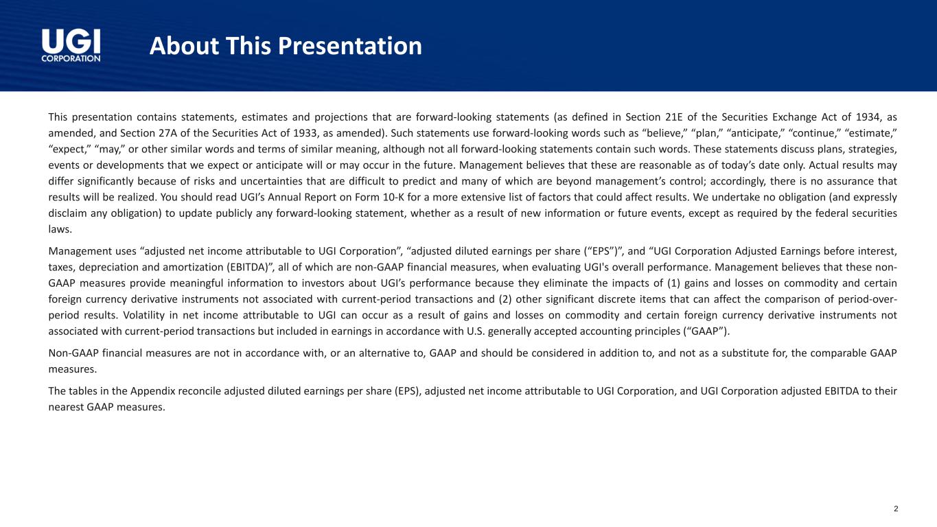 关于本演示文稿2本演示文稿包含前瞻性陈述的陈述、估计和预测(定义见经修订的1934年证券交易法第21E条和经修订的1933年证券法第27A条)。此类陈述使用了“相信”、“计划”、“预期”、“继续”、“估计”、“预期”、“可能”等前瞻性词语,或其他类似含义的词语和术语,尽管并非所有前瞻性陈述都包含此类词语。这些声明讨论了我们预期或预期将在未来发生或可能发生的计划、战略、事件或发展。管理层认为,这些仅在今天的日期是合理的。由于难以预测的风险和不确定性,其中许多是管理层无法控制的,实际结果可能会有很大差异;因此,无法保证一定会实现结果。您应该阅读UGI的10-K表格年度报告,了解更广泛的可能影响结果的因素清单。我们不承担任何义务(并明确否认任何义务)公开更新任何前瞻性陈述,无论是由于新信息或未来事件,除非联邦证券法要求。管理层在评估UGI的整体业绩时使用了“归属于UGI公司的调整后净利润”、“调整后稀释每股收益(“EPS”)”以及“UGI公司调整后利息、税项、折旧及摊销前利润(EBITDA)”,所有这些均为非公认会计准则财务指标。管理层认为,这些非GAAP衡量标准为投资者提供了有关UGI业绩的有意义的信息,因为它们消除了(1)与当期交易无关的商品和某些外币衍生工具的损益以及(2)可能影响期间比较结果的其他重大离散项目的影响。归属于UGI的净利润的波动可能是由于与当期交易无关但根据美国公认会计原则(“GAAP”)计入收益的商品和某些外币衍生工具的损益造成的。非GAAP财务指标不符合或替代GAAP,应作为可比GAAP指标的补充考虑,而不是替代。附录中的表格将调整后的稀释每股收益(EPS)、归属于UGI公司的调整后净利润以及UGI公司调整后的EBITDA与其最接近的GAAP衡量标准进行了核对。
