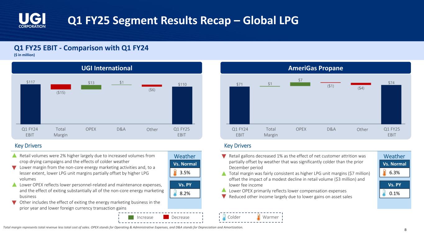 25财年第一季度分部业绩回顾–天然气25财年第一季度息税前利润-与24财年第一季度的比较(百万美元)公用事业中游和营销天气总利润率代表总收入减去总销售成本。就公用事业而言,总利润率也因某些与收入相关的税收而减少。OPEX代表运营和管理费用,D & A代表折旧和摊销。关键驱动因素•核心市场销量增长3%,主要是由于天气转冷•利润率提高主要是由于WV燃气公用事业公司的燃气费率提高(2024年1月1日生效),以及核心市场客户的增长•更高的运营支出反映出,除其他外,更高的人员费用和更高的无法收回的账户费用•更高的D & A费用反映了持续的分销系统资本支出活动的影响3.2% 3.1%与。正常vs. PY增加减少WarmerColder Weather关键驱动因素•利润率下降主要是由于中游利润率降低(1000万美元),由于2024年9月出售一项资产(400万美元)而没有发电利润率以及产能管理活动的利润率下降•较低的运营支出主要反映了较低的工资和福利以及维护费用•较高的其他收入主要是由于不存在上年同期确认的GHI能源减值3.9% 4.2% vs.正常vs. PY Q1 FY24 EBIT Q1 FY25 EBIT总利润率OPEX D & A其他Q1 FY24 EBIT Q1 FY25 EBIT总利润率OPEX D & A其他7