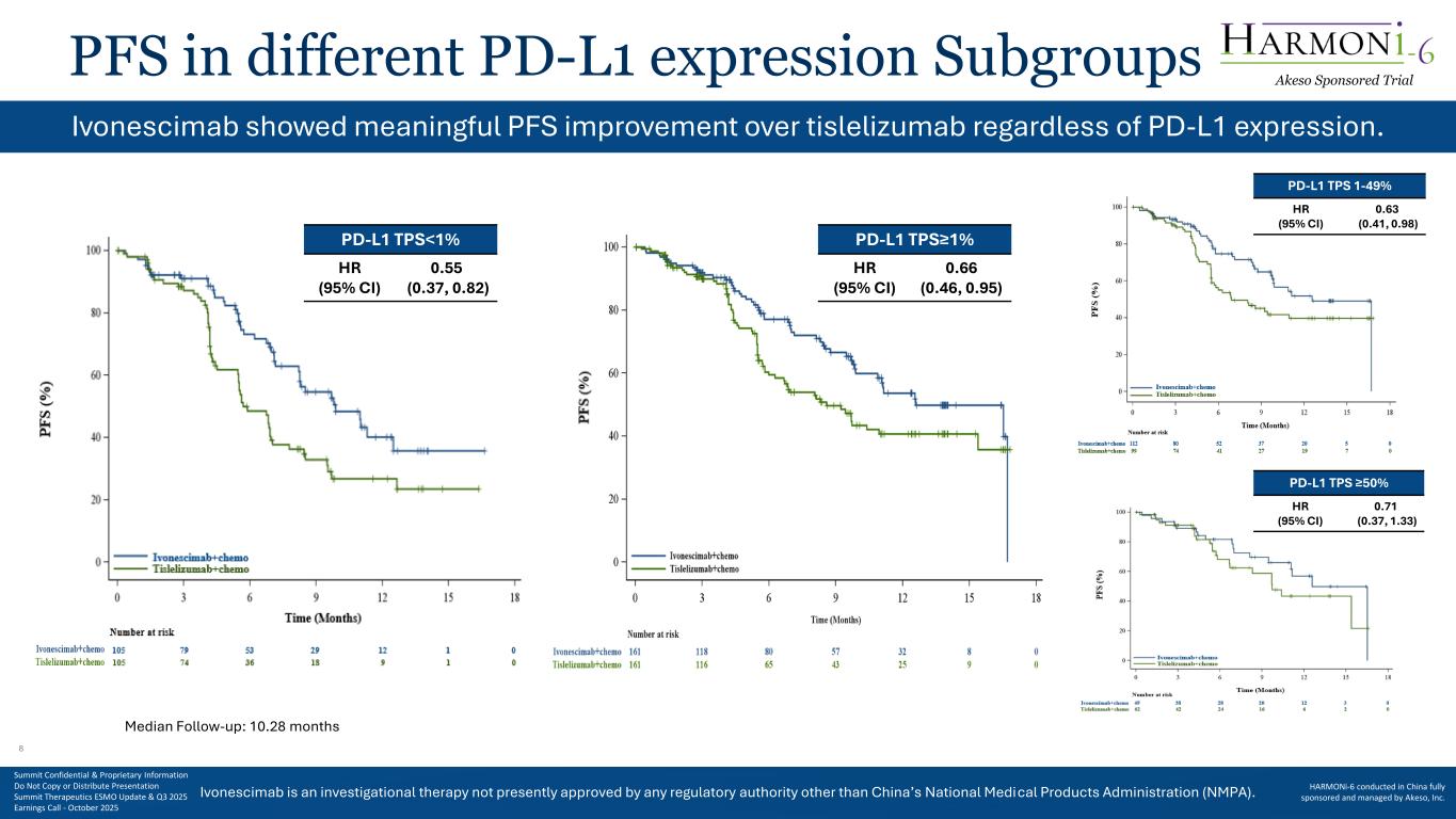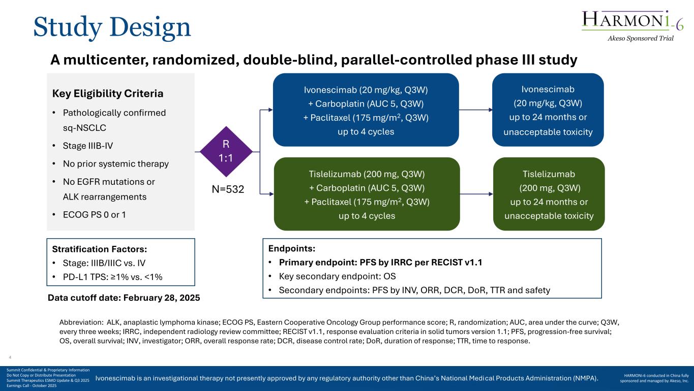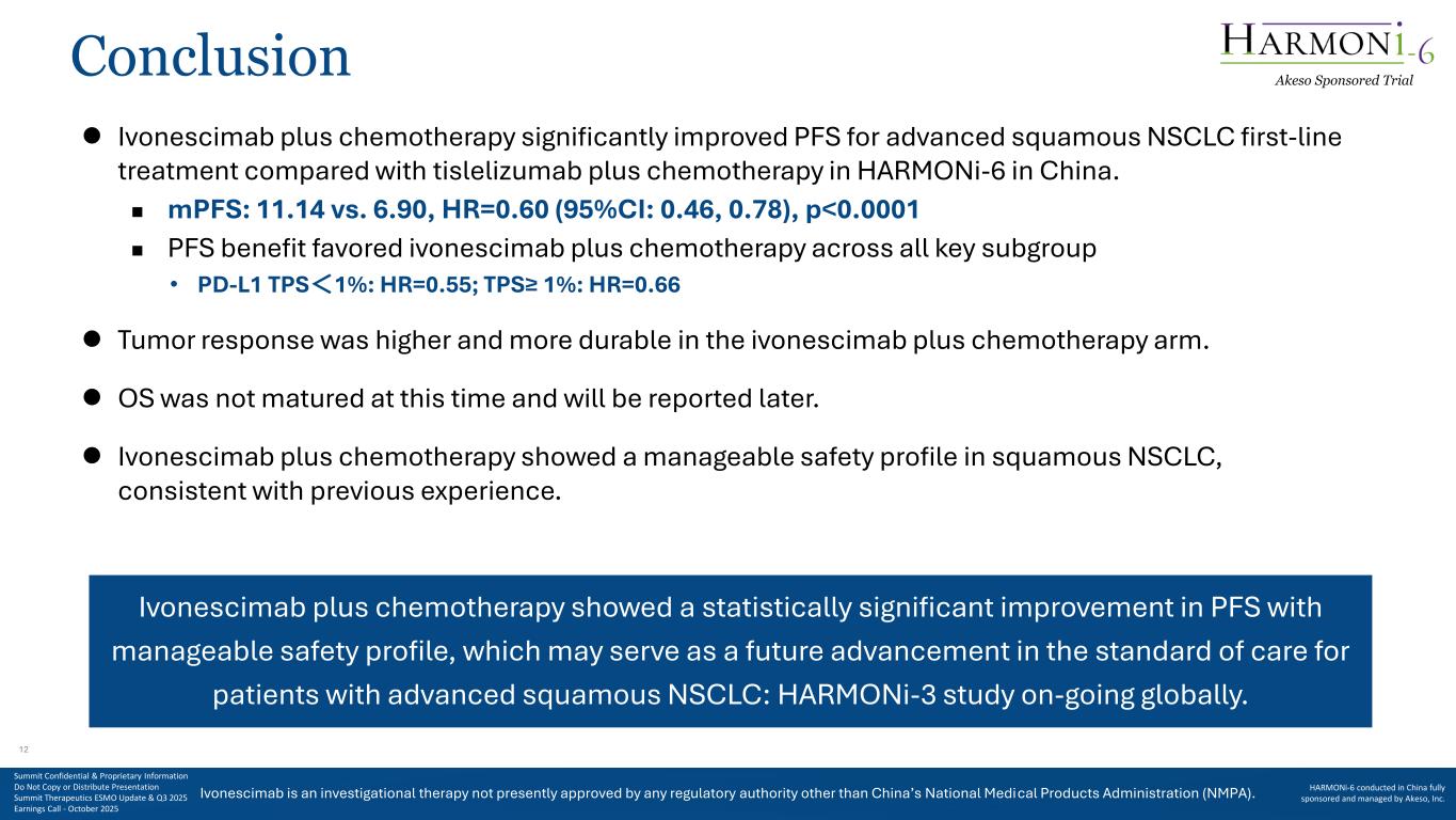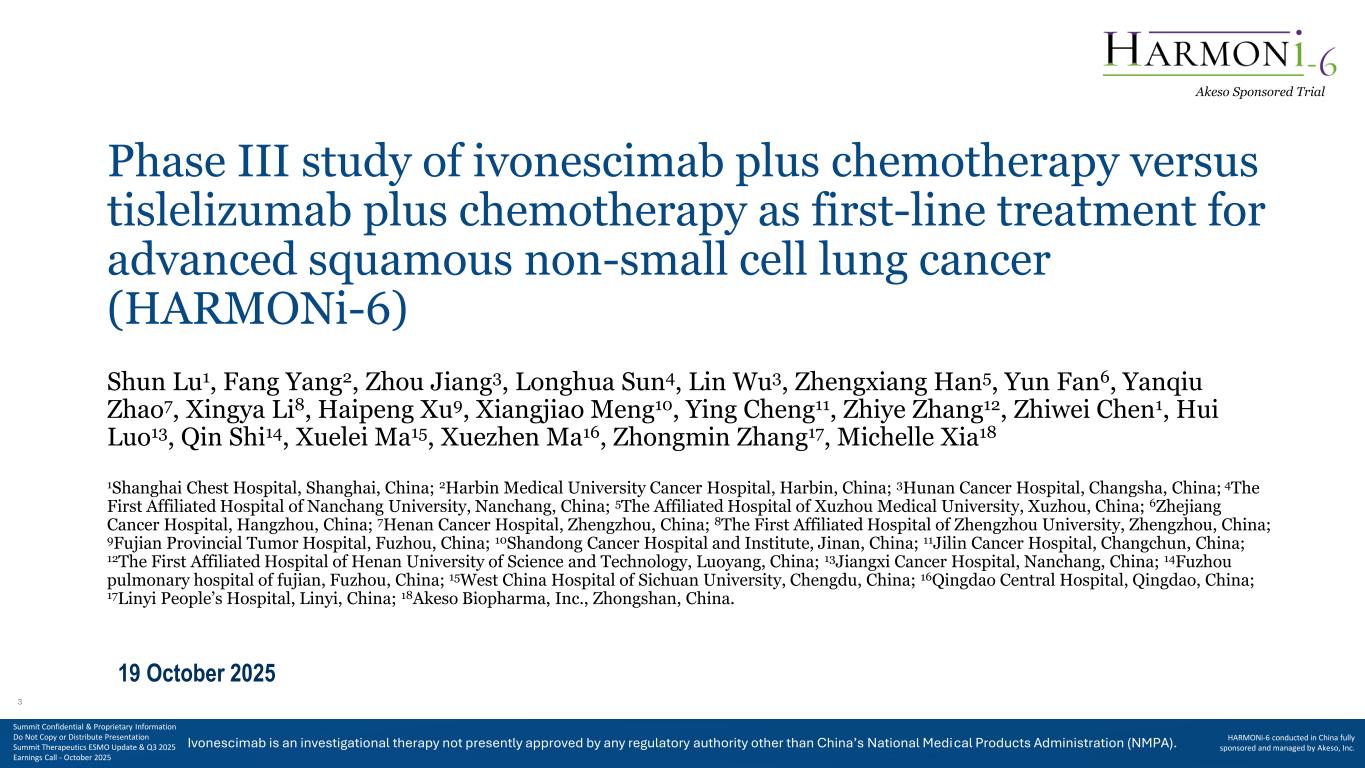 Ivonescimab是一种研究性疗法,目前未获得除中国国家药品监督管理局(NMPA)以外的任何监管机构的批准。2025年10月19日ivonescimab加化疗对比tislelizumab加化疗一线治疗晚期鳞状非小细胞肺癌(HARMONI-6)的III期研究顺路1号、方阳2号、周江3号、龙华Sun4号、林武3号、正向汉5号、云凡6号、燕秋昭7号、星亚Li8号、海鹏X9号、湘郊梦10号、应承11号、智业张12号、志伟陈1号、惠洛13号、秦时14号、学雷Ma15号、学真Ma16号、中民张17号、蜜雪夏18号1上海市胸科医院,中国;2哈尔滨哈医大肿瘤医院,中国;3湖南省肿瘤医院,中国长沙;4南昌大学第一附属医院,中国南昌;5徐州医科大学附属医院中国徐州;6中国杭州浙江省肿瘤医院;7中国郑州河南省肿瘤医院;8中国郑州郑州大学第一附属医院;9中国福州福建省肿瘤医院;10中国济南山东省肿瘤医院及研究所;11中国长春吉林省肿瘤医院;12中国洛阳河南科技大学第一附属医院;13中国南昌江西省肿瘤医院;14中国福州福建福州肺科医院;15中国成都四川大学华西医院;16中国青岛市中心医院;17中国临沂市人民医院;18中国中山Akeso Biopharma,Inc.。Akeso赞助试验Harmoni-6在中国进行,由Akeso,Inc.完全赞助和管理。Summit机密和专有信息不复制或分发演示文稿Summit Therapeutics ESMO更新和2025年第三季度财报电话会议-2025年10月3