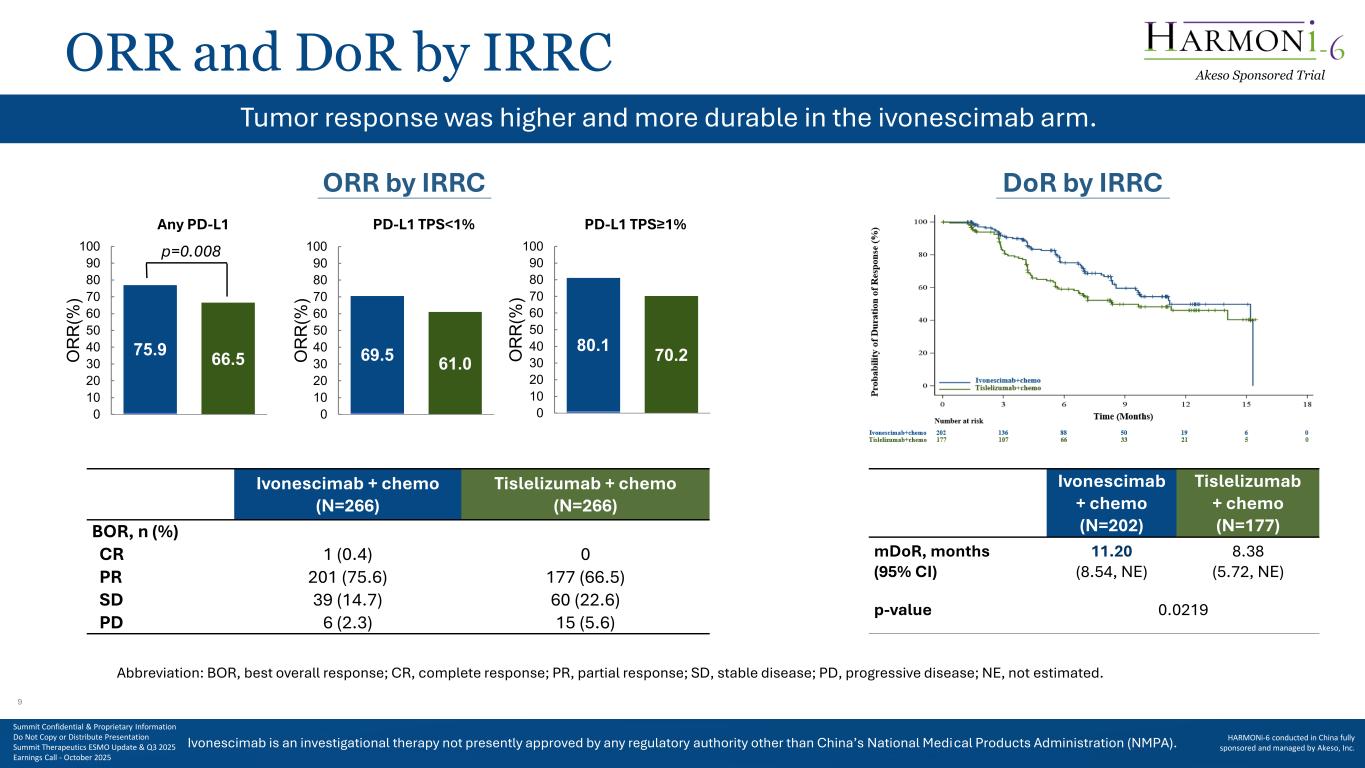 伊沃奈西单抗是一种研究性疗法,目前未获得除中国国家药品监督管理局(NMPA)以外的任何监管机构的批准。IRRC伊沃奈斯单抗+化疗(N = 202)替雷利珠单抗+化疗(N = 177)mDOR,月(95% CI)11.20(8.54,NE)8.38(5.72,NE)p值0.02 19简称:BOR,最佳总应答;CR,完全应答;PR,部分应答;SD,病情稳定;PD,疾病进展;NE,未估计。ivonescimab组的肿瘤反应更高,更持久。伊沃奈西单抗+化疗(N = 266)替雷利珠单抗+化疗(N = 266)BOR,n(%)CR1(0.4)0 PR 201(75.6)177(66.5)SD 39(14.7)60(22.6)PD 6(2.3)15(5.6)75.9 66.50 102030405060708090100 O R R(%)69.56 1.0 102030405060708090100 O R R(%)80.17 0.20 102030405060708090100 O R R(%)ORR by IRRC Any PD-L1 PD-L1 TPS < 1% PD-L1 TPS ≥ 1% DOR by IRRC p = 0.008 Akeso Sponsored Trial Summit机密和专有信息请勿复制或分发演示文稿Summit Therapeutics ESMO更新和2025年第三季度财报电话会议-2025年10月Harmoni-6在中国进行,由Akeso,Inc.完全赞助和管理。9