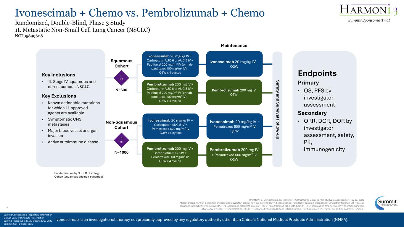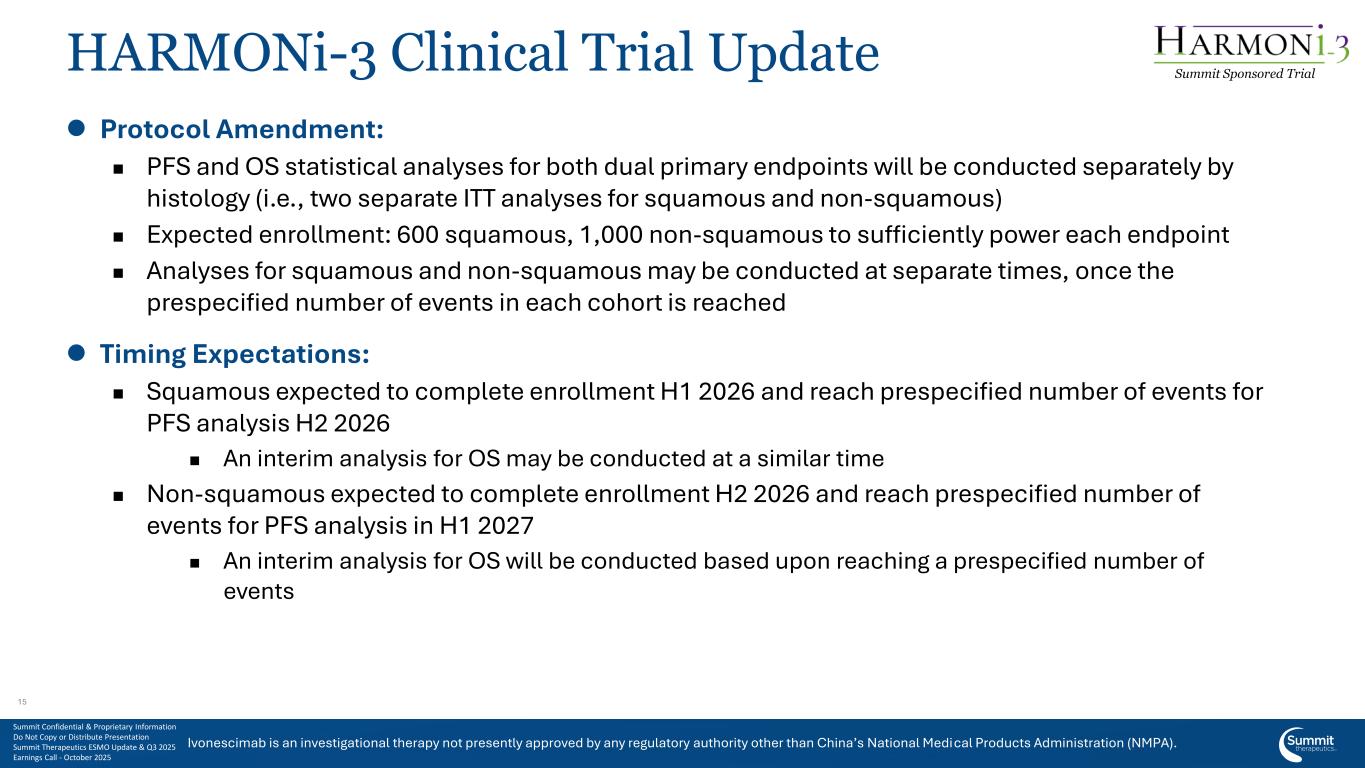 Ivonescimab是一种研究性疗法,目前未获得除中国国家药品监督管理局(NMPA)以外的任何监管机构的批准。Harmoni-3临床试验更新⚫议定书修正案:◼将通过组织学分别对这两个双重主要终点进行PFS和OS统计分析(即对鳞状和非鳞状分别进行两次ITT分析)◼预期入组:600个鳞状,1,000个非鳞状,足以为每个终点提供足够动力◼鳞状和非鳞状的分析可能会在不同的时间进行,一旦达到每个队列中预先指定的事件数量⚫时间预期:◼Squalous预计将于2026年上半年完成注册并达到预设的事件数量以进行PFS分析H2 2026◼OS的中期分析可能会在类似的时间进行◼非鳞癌预计将于2026年下半年完成注册并达到2027年上半年用于PFS分析的预先指定事件数◼将在达到预先指定的活动数量的基础上对OS进行中期分析Summit Sponsored Trial Summit机密和专有信息不复制或分发演示文稿Summit Therapeutics ESMO更新和2025年第三季度财报电话会议-2025年10月15