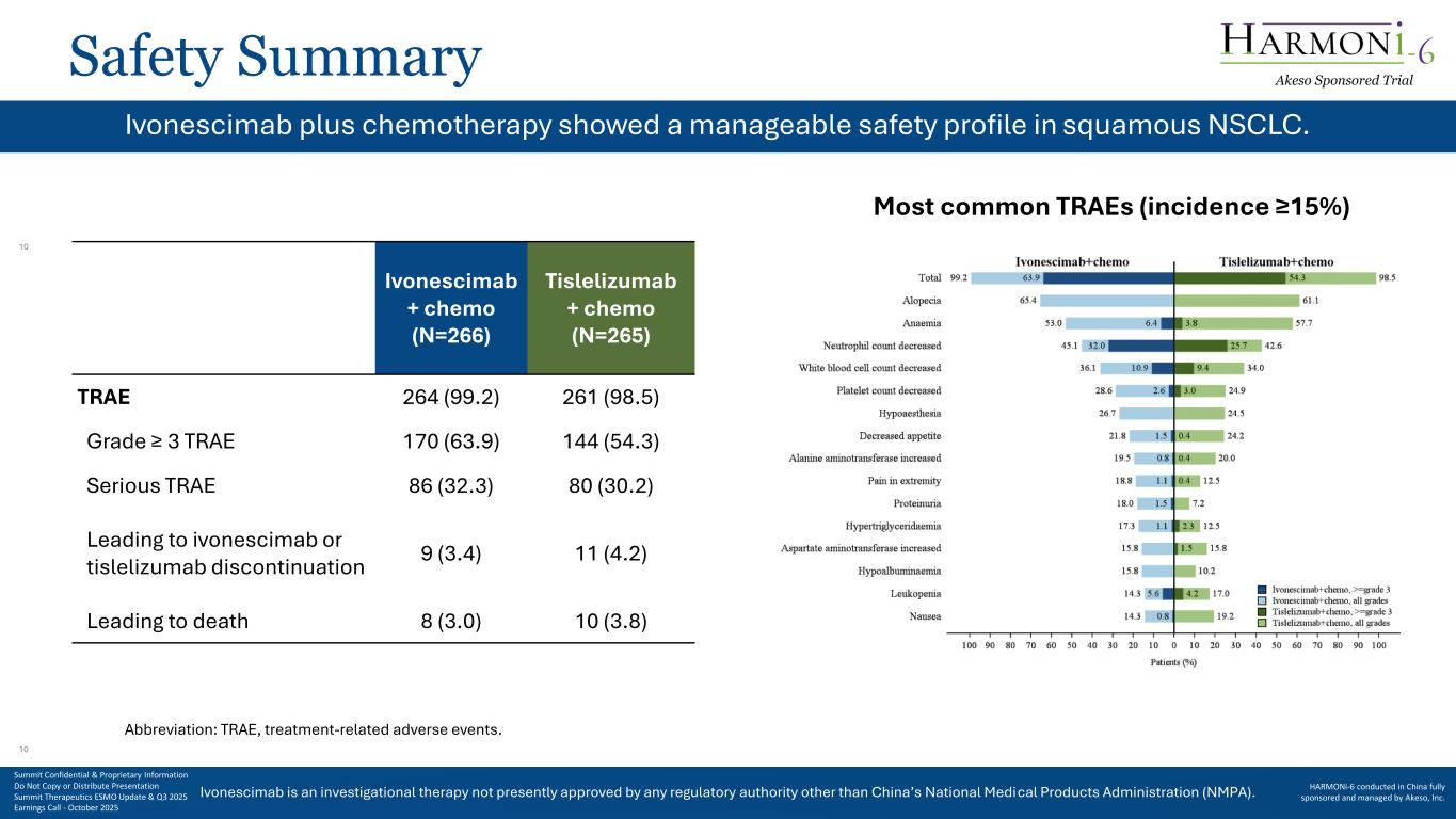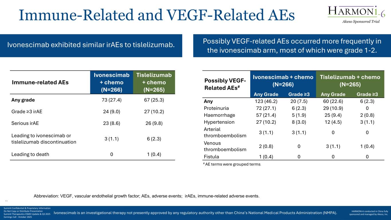 Ivonescimab是一种研究性疗法,目前未获得除中国国家药品监督管理局(NMPA)以外的任何监管机构的批准。安全性概要b最常见的TRAE(发生率≥ 15%)伊沃奈西单抗+化疗(N = 266)替雷利珠单抗+化疗(N = 265)TRAE 264(99.2)261(98.5)3级≥ TRAE 170(63.9)144(54.3)严重TRAE 86(32.3)80(30.2)导致伊沃奈西单抗或替雷利珠单抗停药9(3.4)11(4.2)导致死亡8(3.0)10(3.8)简称:TRAE,治疗相关不良事件。伊沃奈西单抗联合化疗在鳞状NSCLC中显示出可控的安全性。Akeso赞助的Trial Summit机密和专有信息不复制或分发演示文稿Summit Therapeutics ESMO更新和2025年第三季度财报电话会议-2025年10月Harmoni-6在中国进行,由Akeso,Inc.完全赞助和管理。1010