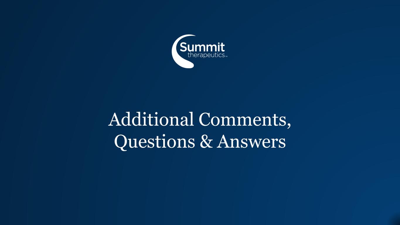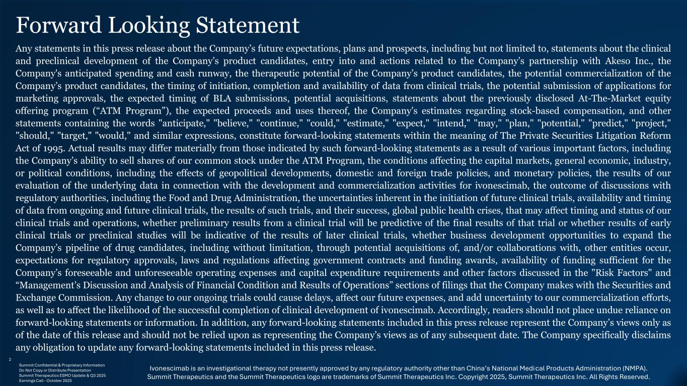 前瞻性声明本新闻稿中有关公司未来预期、计划和前景的任何声明,包括但不限于有关公司候选产品的临床和临床前开发、公司与Akeso Inc.合作的进入和相关行动的声明、公司的预期支出和现金跑道、公司候选产品的治疗潜力、公司候选产品的潜在商业化、临床试验数据的启动、完成和可用性的时间、上市许可申请的潜在提交、BLA提交的预期时间、潜在收购,关于先前披露的市场股票发行计划(“ATM计划”)、预期收益及其用途、公司对基于股票的薪酬的估计,以及包含“预期”、“相信”、“继续”、“可能”、“估计”、“预期”、“打算”、“可能”、“计划”、“潜力”、“预测”、“项目”、“应该”、“目标”、“将”和类似表述的其他陈述,构成1995年《私人证券诉讼改革法案》含义内的前瞻性陈述。由于各种重要因素,包括公司根据ATM计划出售我们普通股的能力、影响资本市场的条件、一般经济、行业或政治条件,包括地缘政治发展、国内外贸易政策和货币政策的影响、我们对与ivonescimab的开发和商业化活动相关的基础数据的评估结果、与包括食品和药物管理局在内的监管机构的讨论结果,实际结果可能与此类前瞻性陈述所表明的结果存在重大差异,可能影响我们临床试验和运营的时间和状态的未来临床试验的启动、正在进行和未来临床试验数据的可用性和时间、此类试验的结果及其成功、全球公共卫生危机所固有的不确定性,临床试验的初步结果是否将预测该试验的最终结果或早期临床试验或临床前研究的结果是否将指示后期临床试验的结果,是否扩大公司候选药物管道的业务发展机会,包括但不限于,通过对其他实体的潜在收购和/或合作发生、对监管批准的预期、影响政府合同和资金奖励的法律法规、足以满足公司可预见和不可预见的运营费用和资本支出要求的资金可用性以及公司向美国证券交易委员会提交的文件的“风险因素”和“管理层对财务状况和运营结果的讨论和分析”部分中讨论的其他因素。我们正在进行的试验的任何变化都可能导致延误,影响我们未来的开支,并为我们的商业化努力增加不确定性,以及影响成功完成ivonescimab临床开发的可能性。因此,读者不应过分依赖前瞻性陈述或信息。此外,本新闻稿中包含的任何前瞻性陈述仅代表公司截至本新闻稿发布之日的观点,不应被视为代表公司截至任何后续日期的观点。该公司明确表示不承担更新本新闻稿中包含的任何前瞻性陈述的任何义务。Summit机密&专有信息不复制或分发演示文稿Summit Therapeutics ESMO更新和2025年第三季度财报电话会议-2025年10月ivonescimab是一种研究性疗法,目前未获得中国国家药品监督管理局(NMPA)以外的任何监管机构的批准。Summit Therapeutics及Summit Therapeutics标识为Summit Therapeutics Inc.的商标,TERM2版权所有2025,Summit Therapeutics Inc.保留所有权利。2