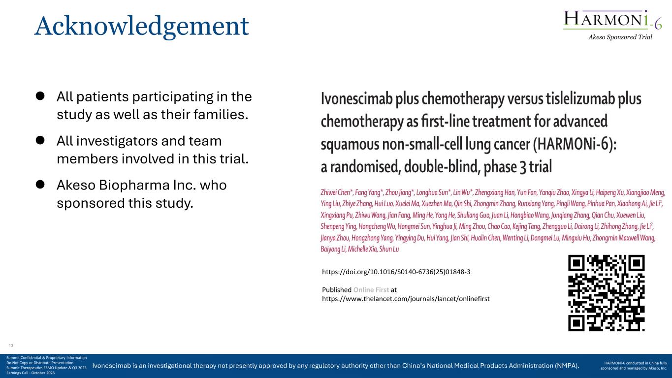 Ivonescimab是一种研究性疗法,目前未获得除中国国家药品监督管理局(NMPA)以外的任何监管机构的批准。致谢⚫所有参与研究的患者以及他们的家人。⚫所有参与此次审判的调查人员和团队成员。⚫赞助这项研究的Akeso Biopharma Inc.。https://doi.org/10.1016/S0140-6736(25)01848-3首先在线发布于https://www.thelancet.com/journals/lancet/onlinefirst Akeso赞助的试验峰会机密和专有信息请勿复制或分发演示文稿Summit Therapeutics ESMO更新和2025年第三季度收益电话会议-2025年10月由Akeso,Inc.完全赞助和管理的中国进行的Harmoni-6 13