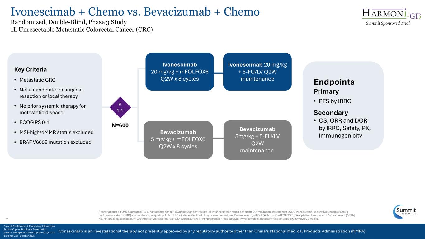 Ivonescimab是一种研究性疗法,目前未获得除中国国家药品监督管理局(NMPA)以外的任何监管机构的批准。17项关键标准•转移性CRC •不是手术切除或局部治疗的候选者•既往未对转移性疾病进行全身治疗• ECOG PS 0-1 • MSI-high/dMMR状态排除• BRAF V600E突变排除贝伐珠单抗5 mg/kg + mFOLFOX6 Q2W x8个周期ivonescimab 20 mg/kg + mFOLFOX6 Q2W x8个周期贝伐珠单抗5mg/kg + 5-FU/LV Q2W维持ivonescimab 20 mg/kg + 5-FU/LV Q2W维持R 1:1 n = 600终点主要• IRRC次级的PFS • IRRC次级的OS、ORR和DOR,安全性,PK,免疫原性简称:5-FU = 5-氟尿嘧啶;CRC =结直肠癌;DCR =疾病控制率;dMMR =错配修复缺陷;DOR =应答持续时间;ECOG PS =东部肿瘤协作组绩效状态;HRQOL =健康相关生活质量;IRRC =独立放射学审评委员会;LV =亚叶酸;mFOLFOX6 =修饰的FOLFOX6 [奥沙利铂+亚叶酸+ 5-氟尿嘧啶(5-FU)];MSI =微卫星不稳定性;ORR =客观反应率,OS =总生存期;PFS =无进展生存期;PK =药代动力学;R =随机化;Q2W =每2周一次。Ivonescimab是一种研究性疗法,目前未获得除中国国家药品监督管理局(NMPA)以外的任何监管机构的批准。Summit赞助的试验Summit机密和专有信息请勿复制或分发演示文稿Summit Therapeutics ESMO更新和2025年第三季度财报电话会议-2025年10月ivonescimab + Chemo vs. Bevacizumab + Chemo随机、双盲、3期研究1L不可切除的转移性结直肠癌(CRC)17