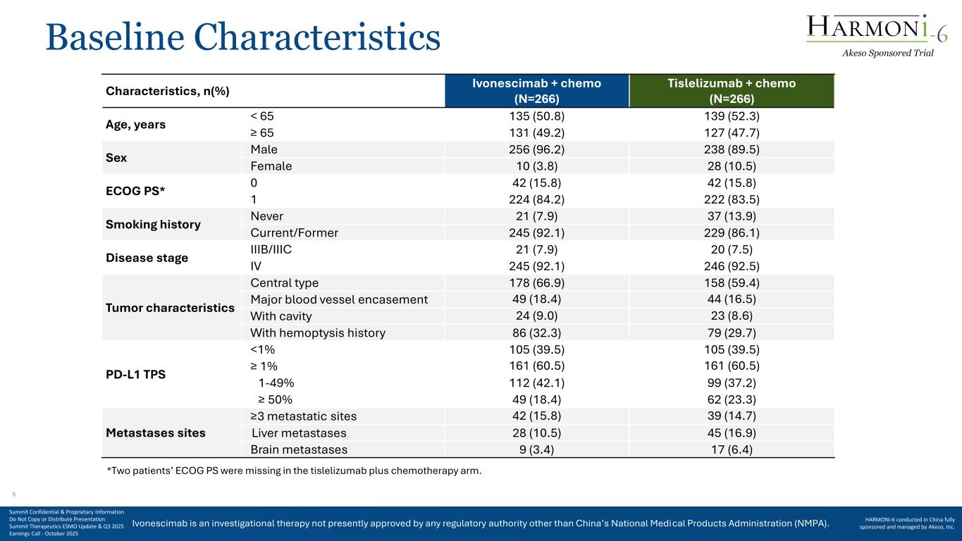 Ivonescimab是一种研究性疗法,目前未获得除中国国家药品监督管理局(NMPA)以外的任何监管机构的批准。基线特征特征,n(%)ivonescimab + chemo(n = 266)替雷利珠单抗+ chemo(n = 266)年龄,年< 65135(50.8)139(52.3)≥ 65131(49.2)127(47.7)性别男性256(96.2)238(89.5)女性10(3.8)28(10.5)ECOG PS*042(15.8)42(15.8)1224(84.2)222(83.5)吸烟史从未21(7.9)37(13.9)现在/过去245(92.1)229(86.1)疾病III期IB/II期21(7.9)20(7.5)IV 245(92.1)246(92.5)肿瘤特征中心型178(66.9)158(59.4)大血管包扎49(18.4)44(16.5)有腔24(9.0)23(8.6)有咯血史86(32.3)79(29.7)PD-L1 TPS < 1% 105(39.5)105(39.5)≥ 1% 161(60.5)161(60.5)1-49 % 112(42.1)99(37.2)≥ 50% 49(18.4)62(23.3)转移部位≥ 3个转移部位42(15.8)39(14.7)肝转移28(10.5)45(16.9)脑转移9(3.4)17(6.4)*两名患者的ECOG PS在替雷利珠单抗加化疗组中缺失。Akeso赞助的Trial Summit机密和专有信息不复制或分发演示文稿Summit Therapeutics ESMO更新和2025年第三季度财报电话会议-2025年10月Harmoni-6在中国进行,由Akeso,Inc.完全赞助和管理。5