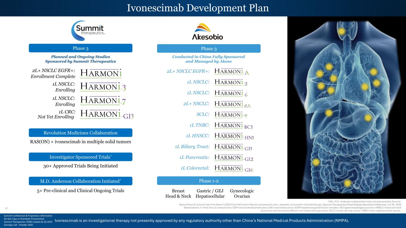 Ivonescimab是一种研究疗法,目前未获得除中国国家药品监督管理局(NMPA)以外的任何监管机构的批准。1-2期3期1L胆道:1L胰腺:1L结直肠:1L NSCLC:2L + NSCLC EGFR +:1L TNBC:2L + NSCLC:1L NSCLC:SCLC:1L HNSCC:在中国进行由Akeso乳房头颈胃/GEJ肝细胞妇科卵巢3期30 +批准的试验正在启动研究者赞助的试验*由Summit Therapeutics M.D. Anderson合作赞助的有计划和正在进行的研究启动*5 +临床前和临床正在进行的试验RAS(ON)+ ivonescimab在多个实体瘤中的合作入组1L NSCLC:1L NSCLC:入组2L + NSCLC EGFR +:入组完成1L CRC:尚未入组*ISTs,M.D.安德森合作试验不是由Summit赞助的。Akeso III期临床试验来自Akeso的2025年上半年中期结果(prnewswire.com;akesobio.com)和/或clinicaltrials.gov;Summit Therapeutics新闻稿Revolution Medicines。2025年6月30日简称:1L =一线;2L =二线;CDP =临床开发计划;CRC =结直肠癌;EGFR =表皮生长因子受体;GEJ =胃食管交界处;HNSCC =头颈部鳞状细胞癌;NSCLC =非小细胞肺癌;SCLC =小细胞肺癌;TNBC =三阴性乳腺癌。ivonescimab开发计划峰会机密和专有信息不复制或分发演示文稿Summit Therapeutics ESMO更新和2025年第三季度财报电话会议-2025年10月14