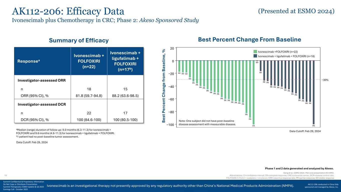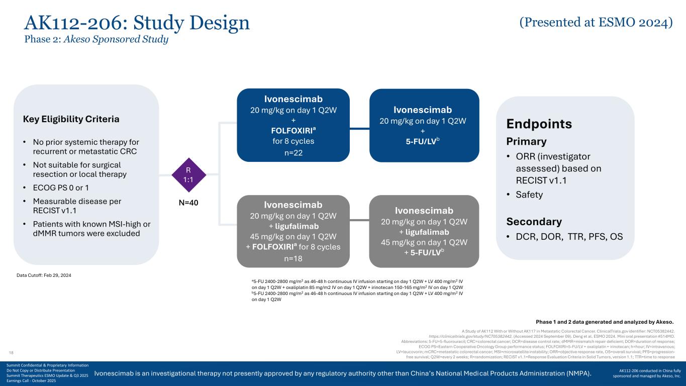 Ivonescimab是一种研究性疗法,目前未获得除中国国家药品监督管理局(NMPA)以外的任何监管机构的批准。AK112-206:研究设计2期:Akeso赞助研究AK112伴或不伴AK117在转移性结直肠癌中的研究。ClinicalTrials.gov标识符:NCT05382442。https://clinicaltrials.gov/study/NCT05382442。(2024年9月09日访问)。Deng等人ESMO 2024。迷你口头报告# 514MO。简称:5-FU = 5-氟尿嘧啶;CRC =结直肠癌;DCR =疾病控制率;dMMR =错配修复缺陷;DOR =应答持续时间;ECOG PS =东协肿瘤组绩效状态;FOLFOXIRI = 5-FU/LV +奥沙利铂+伊立替康;h =小时;IV =静脉注射;LV =亚叶酸;mCRC =转移性结直肠癌;MSI =微卫星不稳定性;ORR =客观缓解率,OS =总生存期;PFS =无进展生存期;Q2W =每2周一次;R =随机化;RECIST v1.1 =实体瘤中的应答评估标准,1.1版本;TTR =反应时间a5-FU 2400-2800 mg/m2为46-48小时连续静脉输注开始于第1天Q2W + LV 400 mg/m2于第1天Q2W +奥沙利铂85 mg/m2于第1天Q2W +伊立替康150-165 mg/m2于第1天Q2W b5-FU 2400-2800 mg/m2为46-48小时连续静脉输注开始于第1天Q2W + LV 400 mg/m2于第1天Q2W 1期和2期数据由Akeso生成和分析。数据截止:2024年2月29日端点Primary • ORR(研究者评估)基于RECIST v1.1 •安全性Secondary • DCR、DOR、TTR、PFS,OS R 1:1关键资格标准•既往没有针对复发或转移性CRC的全身治疗•不适合手术切除或局部治疗• ECOG PS 0或1 •根据RECIST v1.1可测量的疾病•已知MSI高或DMMR肿瘤的患者在第1天Q2W排除ivonescimab 20 mg/kg + FOLFOXIRIA 8个周期n = 22 ivonescimab 20 mg/kg在第1天Q2W + ligufalimab 45 mg/kg在第1天Q2W + FOLFOXIRIA8个周期n = 18ivonescimab第1天Q2W 20mg/kg + 5-FU/LVb ivonescimab第1天Q2W 20mg/kg + ligufalimab第1天Q2W 45mg/kg + 5-FU/LVb N = 4018 Summit机密和专有信息请勿复制或分发演示文稿Summit Therapeutics ESMO更新和2025年第三季度收益电话会议-2025年10月AK112-206在中国进行,由Akeso,Inc.完全赞助和管理(在ESMO 2024上展示)