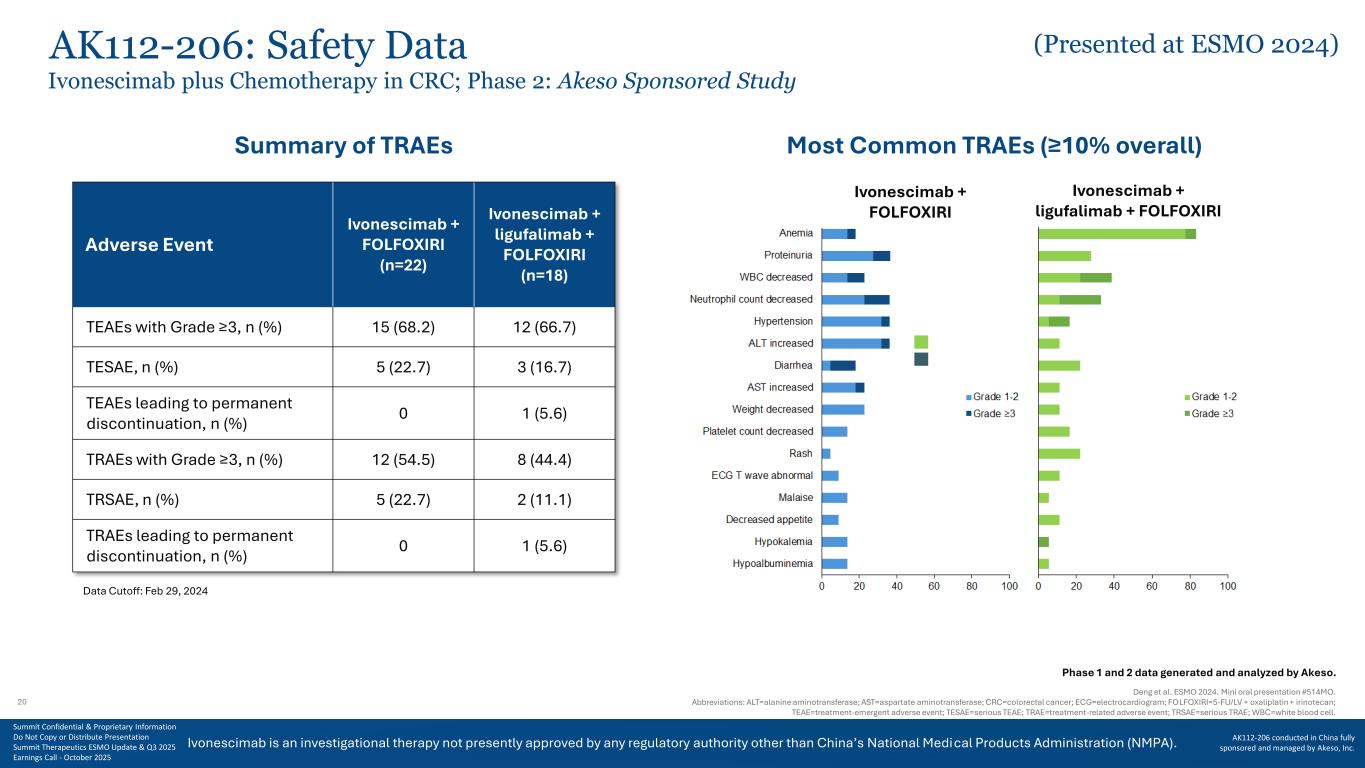 Ivonescimab是一种研究性疗法,目前未获得除中国国家药品监督管理局(NMPA)以外的任何监管机构的批准。AK112-206:Efficacy Data Deng et al. ESMO 2024。迷你口头报告# 514MO。简称:CI =置信区间;CR =完全应答;CRC =结直肠癌;DCR =疾病控制率;FOLFOXIRI = 5-FU/LV +奥沙利铂+伊立替康;ORR =客观应答率;PR =部分应答;SD =稳定应答数据截止:2024年2月29日注:1名受试者未进行具有可测量疾病的基线后疾病评估。B es t p er ce nt c ha ng e fr om b as el in e,% ivonescimab + FOLFOXIRI(n = 22)ivonescimab + ligufalimab + FOLFOXIRI(n = 18)− 30% 200 − 20 − 40 − 60 − 80 − 100 best percent change from baseline responsea ivonescimab + FOLFOXIRI(n = 22)ivonescimab + ligufalimab + FOLFOXIRI(n = 17b)investigator-assessed ORR n 1815 ORR(95% CI),% 81.8(59.7-94.8)88.2(63.6-98.5)investigator-assessed DCR n 2217 DCR(% 100(84.6-100)100(80.5-100)a中位(范围)随访时长:ivonescimab + FOLFOXIRI为9.0个月(6.3-11.3),ivonescimab + ligufalimab + FOLFOXIRI为9.6个月(4.6-11.3)。b1患者无基线后肿瘤评估。艾沃西单抗联合化疗在CRC中的疗效总结;2期:Akeso赞助的研究数据截止:2024年2月29日Akeso生成和分析的1期和2期数据。19 Summit机密和专有信息不复制或分发演示文稿Summit Therapeutics ESMO更新和2025年第三季度财报电话会议-2025年10月AK112-206在中国进行,由Akeso,Inc.完全赞助和管理(在ESMO 2024上演示)