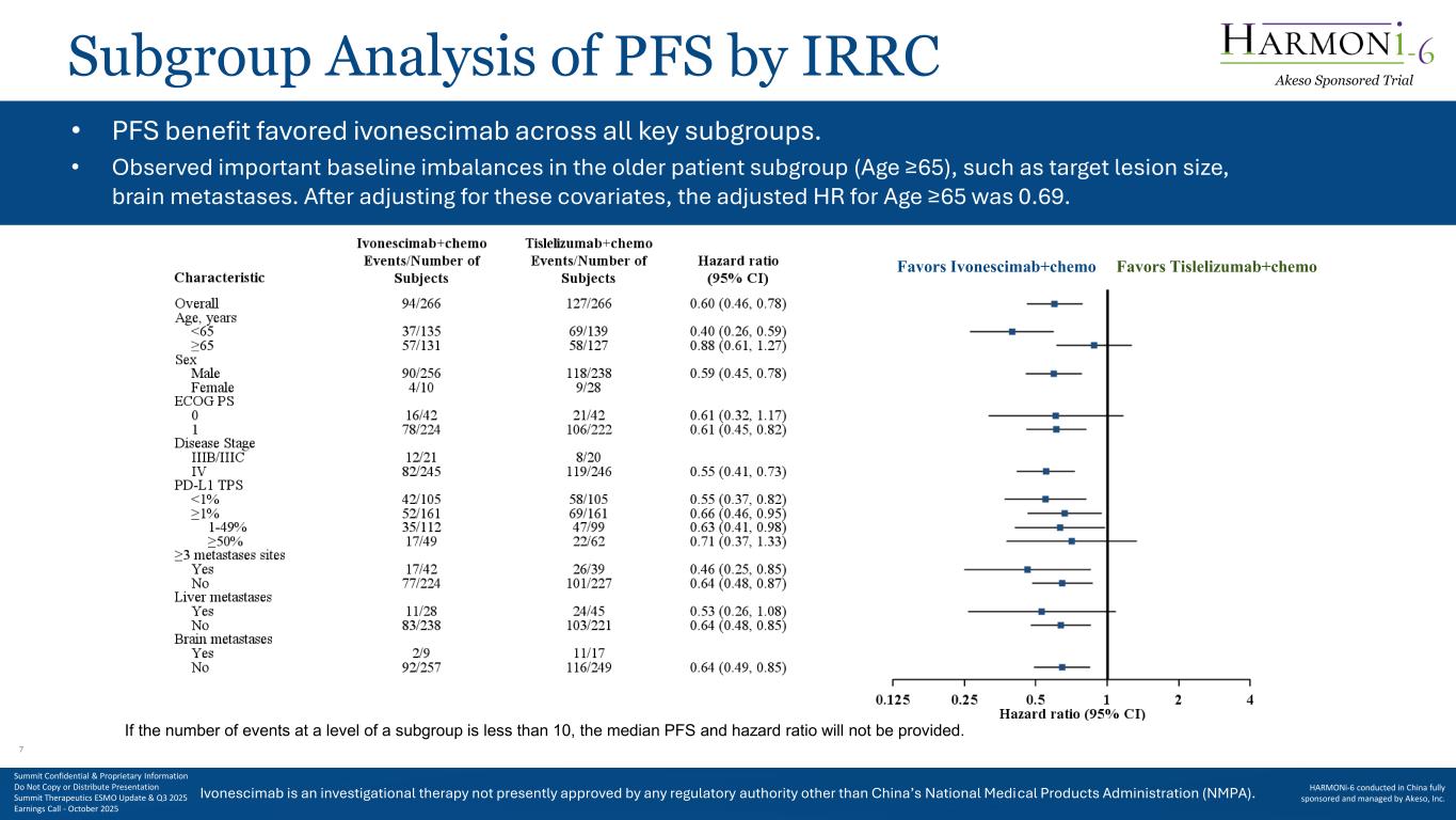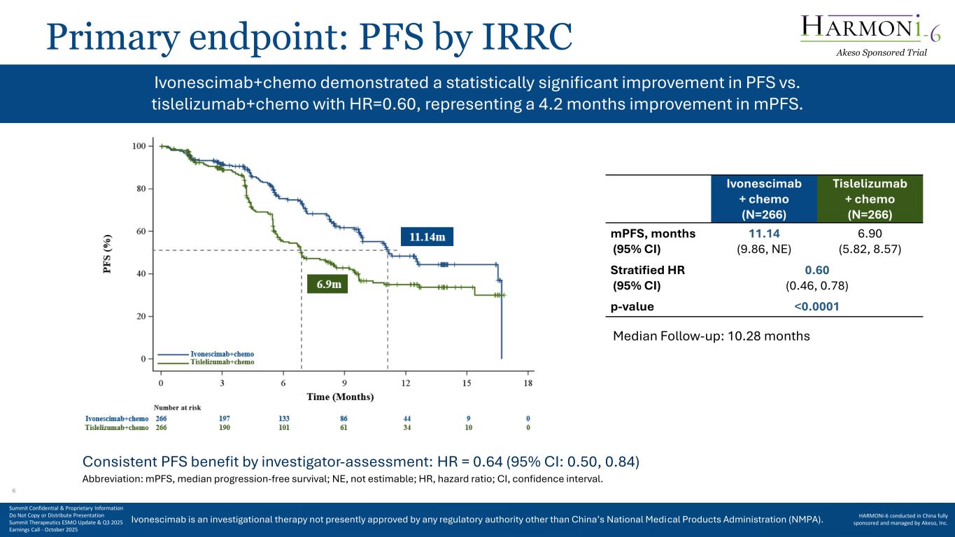 Ivonescimab是一种研究性疗法,目前未获得除中国国家药品监督管理局(NMPA)以外的任何监管机构的批准。主要终点:IRRC ivonescimab + chemo(N = 266)Tislelizumab + chemo(N = 266)mPFS,月(95% CI)11.14(9.86,NE)6.90(5.82,8.57)分层HR(95% CI)0.60(0.46,0.78)p值< 0.0001简称:mPFS,中位无进展生存期;NE,不可估计;HR,风险比;CI,置信区间。中位随访:10.28个月伊沃奈西单抗+化疗与替雷利珠单抗+化疗相比,在HR = 0.60的情况下显示出统计学上显着的PFS改善,代表mPFS改善4.2个月。研究者评估得出的一致PFS收益:HR = 0.64(95% CI:0.50,0.84)Akeso赞助的试验Summit机密和专有信息不复制或分发演示文稿Summit Therapeutics ESMO更新和2025年第三季度财报电话会议-2025年10月由Akeso,Inc.完全赞助和管理的Harmoni-6在中国进行