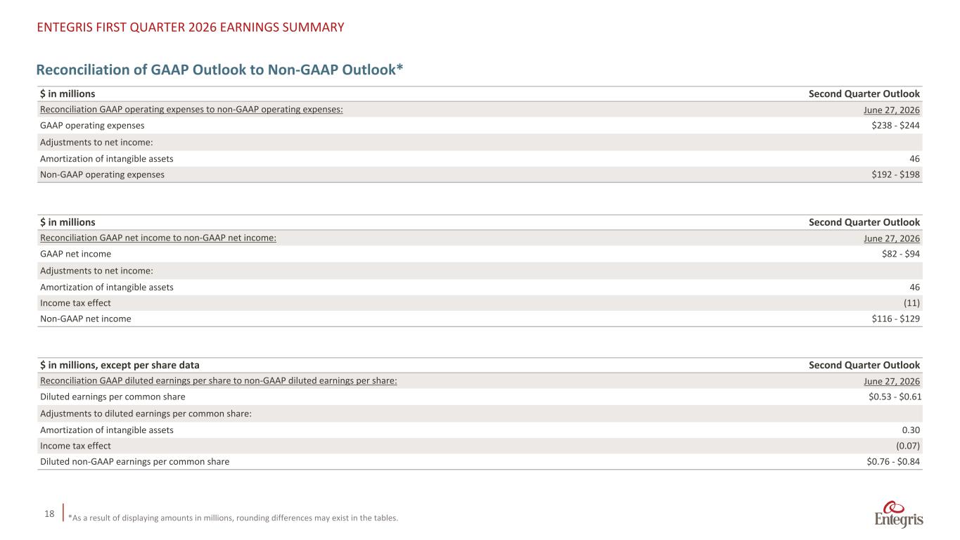 17 entegris 2026年第一季度收益摘要1。包括员工解雇福利、合同终止成本和资产减值费用在内的离散成本节约举措产生的重组费用,主要涉及(i)内部重组,将两个互补部门合并为一个部门并重新调整我们面向客户的组织,以及(ii)裁员、合同终止成本和放弃某些对公司长期目标不再必要的资本设备。2.出售小型工业专用化学品业务的非经常性净亏损。3.与收购中获得的无形资产相关的非现金摊销费用。4.我们的定期贷款融资在2025年和2026年的债务清偿损失。5.净收入的税前调整的税收影响是使用相应年度的适用边际税率计算的。GAAP净收入和稀释后的每股普通股收益与非GAAP净收入和稀释后的非GAAP每股普通股收益的对账,单位:百万美元,每股数据除外1Q25 2Q25 3Q25 4Q25 FY2025 1Q26 GAAP净收入$ 62.9 $ 52.8 $ 70.5 $ 49.4 $ 235.6 $ 92.0重组成本12.41 3.3 1.71 2.32 9.7 4.1出售业务损失2 ———— 10.9 10.9 ——无形资产摊销346.146.04 6.0 46.3 184.4 46.3债务清偿损失4 —— 1.7 1.5 3.2 0.5净收益调整的税收影响和离散项目5(9.9)(11.5)(10.0)(13.9)(45.3)(10.4)非美国通用会计准则净利润101.5 100.6 109.9 106.54 18.513 2.5稀释后每股普通股收益0.41美元0.35美元0.46美元0.32美元1.55美元0.60净收益调整的影响0.25美元0.31美元0.26美元0.37美元1.20美元0.26美元稀释后非美国通用会计准则每股普通股收益0.67美元0.66美元0.72美元0.70美元2.75美元0.86美元稀释后加权平均流通股152.0美元151.9美元152.3美元152.5美元152.2美元153.2美元