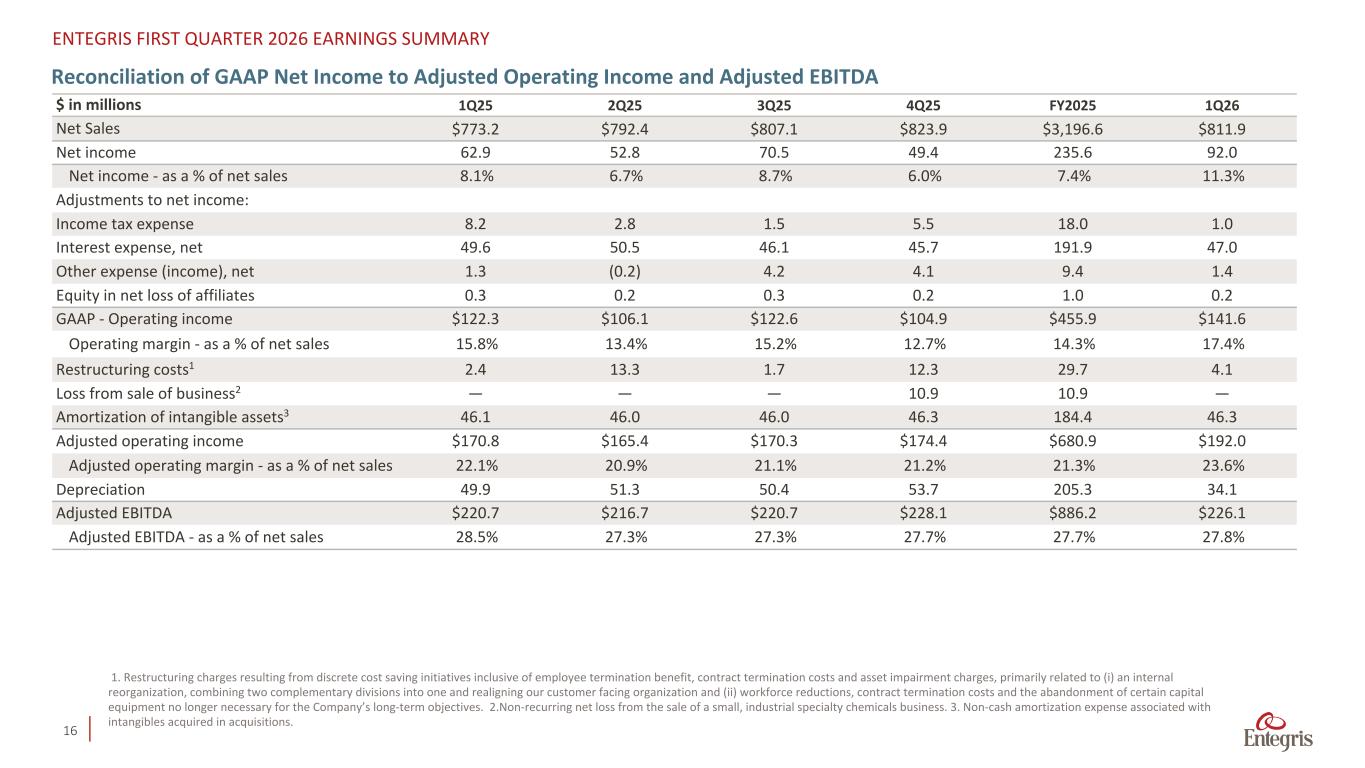 2 Safe Harbor ENTEGRIS 2026年第一季度收益摘要本演示文稿包含“前瞻性陈述”。“相信”、“预期”、“预期”、“打算”、“估计”、“预测”、“项目”、“应该”、“可能”、“将”、“将”或其否定词和类似表述旨在识别此类前瞻性陈述。这些前瞻性陈述仅基于截至本新闻稿发布之日管理层当前的预期和假设。它们不是对未来业绩的保证,它们涉及难以预测的重大风险和不确定性,可能导致实际结果与这些前瞻性陈述中表达或暗示的结果存在重大差异。这些风险和不确定因素包括但不限于半导体需求和半导体制造业总体数量的波动;全球经济不确定性的影响,包括金融市场波动,这可能导致消费者支出下降、通胀压力、更高的利率环境、经济衰退和银行不稳定;供应链中断和公司对唯一、单一和有限来源供应商的依赖以及相关的原材料短缺和成本增加;与公司国际业务相关的运营、政治、法律和其他风险,包括在不同国家雇用和整合工人方面的挑战,在我们经营所在的不同司法管辖区保持适当的商业行为,与全球、区域和当地第三方服务提供商以及与地缘政治不确定性以及区域和全球不稳定和敌对行动相关的风险进行接触和管理,包括但不限于乌克兰和俄罗斯之间持续的冲突、中东冲突,以及全球对此的应对措施;出口管制、经济制裁,和类似的限制;公司客户群的集中和巩固;公司满足快速需求转移的能力;公司持续技术创新和推出新产品以满足客户快速变化的要求的能力;制造和其他运营中断或延误;IT系统故障、网络中断和网络安全风险;国际贸易争端导致的关税、额外税收和其他保护主义措施,紧张的国际关系以及外国和国家安全政策的变化;与危险材料的使用和制造相关的风险;商誉减值;吸引和留住合格人员方面的挑战;公司保护和执行知识产权的能力;人工智能;公司的环境、社会和治理承诺;法律和监管风险,包括与环境、健康和安全、会计标准和公司治理相关的法律法规的变化,跨公司经营所在的司法管辖区;税收或不利税务裁决的变化;获得政府奖励的能力以及竞争对手从公司不符合条件的政府奖励中受益的可能性;公司债务的金额和后果,公司偿还债务和获得未来融资的能力,以及公司在当前未偿还信贷额度下的义务;公司股价波动;支付现金股息和采用未来股份回购计划;公司有效实施任何组织变革的能力;实质性竞争;公司识别、完成和整合收购、合资、资产剥离或其他类似交易的能力;气候变化的影响;以及其他事项。这些风险和不确定性还包括但不限于公司于2026年2月11日向美国证券交易委员会(“SEC”)提交的截至2025年12月31日的财政年度的10-K表格年度报告中描述的风险因素和附加信息,包括在项目1A的“风险因素”标题下,以及公司向SEC提交的其他定期文件中描述的风险因素和附加信息。除联邦证券法和SEC规则和条例要求外,公司不承担更新此处包含的任何前瞻性陈述或信息的义务,其中谈到了各自的日期。本演示文稿包含对“调整后净销售额”的引用, “调整后EBITDA”、“调整后EBITDA –占净销售额的百分比”、“调整后营业收入”、“调整后营业利润率”、“调整后毛利”、“调整后毛利率–占净销售额的百分比”、“调整后分部利润”、“调整后分部利润率”、“非美国通用会计准则营业费用”、“非美国通用会计准则税率”、“非美国通用会计准则净收入”、“稀释后的非美国通用会计准则每股普通股收益”、“自由现金流”,以及其他未按照公认会计准则列报的计量指标。非GAAP财务指标不应被孤立地考虑或作为GAAP财务指标的替代品,而应与GAAP财务指标一起阅读。有关此类措施与最直接可比的公认会计原则措施的调节的更多信息,可在本演示文稿的附件中找到。