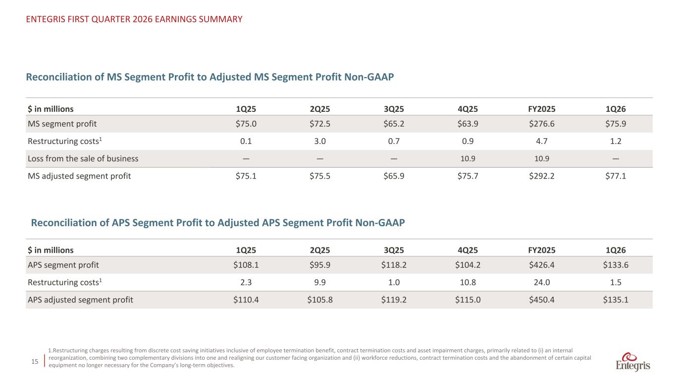 14 Entegris 2026年第一季度收益摘要1。包括员工解雇福利、合同终止成本和资产减值费用在内的离散成本节约举措产生的重组费用,主要涉及(i)内部重组,将两个互补部门合并为一个部门并重新调整我们面向客户的组织,以及(ii)裁员和放弃某些对公司长期目标不再必要的资本设备。2.出售小型工业专用化学品业务的非经常性净亏损。3.与收购中获得的无形资产相关的非现金摊销费用。GAAP营业费用(如报告)与非GAAP百万美元的对账1Q25 2Q25 3Q25 4Q25 FY2025 1Q26 GAAP营业费用$ 234.2 $ 245.4 $ 228.7 $ 255.7 $ 964.0 $ 239.2营业费用调整:重组成本12.21 1.2 1.4 10.625.4 3.8出售业务损失2 ———— 10.9 10.9 —无形资产摊销346.146.0 46.046.3 184.4 46.3非GAAP营业费用$ 185.9 $ 188.2 $ 181.3 $ 187.9 $ 743.3 $ 189.1