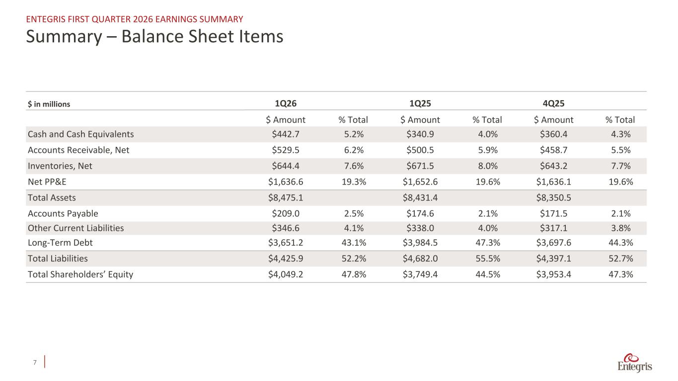 6销售额增长(YOY)主要受液体过滤和FOUPS强劲增长推动。销售额与上一季度(SEQ)保持一致。调整后的分部利润率增长(YOY和SEQ)主要是由生产力和效率行动、产品组合以及126年第一季度使用寿命会计变化带来的好感度推动的。百万美元2016年1季度25年4季度25年1季度26年4季度净销售额463.6美元433.9美元464.56.8%(0.2)%分部利润133.6美元108.1美元104.223.6% 28.2%分部利润率28.8% 24.9% 22.4% Adj.分部利润1美元135.1美元110.4美元115.02 2.4% 17.5% Adj.分部利润率1 29.1% 25.4% 24.8% Advanced Purity Solutions(APS)ENTEGRIS 2026年第一季度收益摘要2016年第一季度亮点1.见附录中的GAAP与非GAAP调节表。