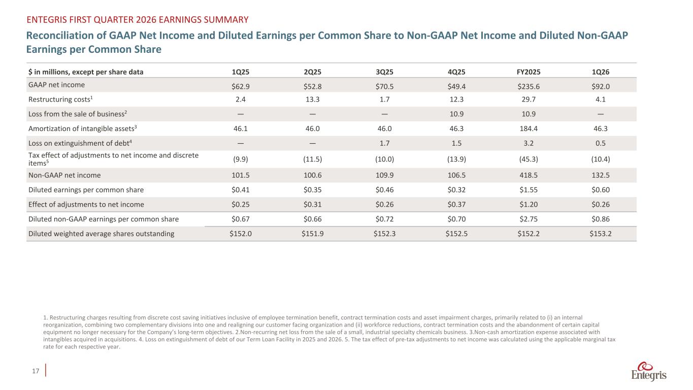 16 Entegris 2026年第一季度收益摘要1。包括员工解雇福利、合同终止成本和资产减值费用在内的离散成本节约举措产生的重组费用,主要涉及(i)内部重组,将两个互补部门合并为一个部门并重新调整我们面向客户的组织,以及(ii)裁员、合同终止成本和放弃某些对公司长期目标不再必要的资本设备。2.出售小型工业专用化学品业务的非经常性净亏损。3.与收购中获得的无形资产相关的非现金摊销费用。GAAP净收入与调整后营业收入和调整后EBITDA的对账(百万美元)1Q25 2Q25 3Q25 4Q25 FY2025 1Q26净销售额$ 773.2 $ 792.4 $ 807.1 $ 823.9 $ 3,196.6 $ 811.9净收入62.95 2.87 0.54 9.42 35.69 2.0净收入-占净销售额的百分比8.1% 6.7% 8.7% 6.0% 7.4% 11.3%净收入调整:所得税费用8.2 2.8 1.55.5 18.0 1.0利息费用,净额49.65 0.546.14 5.7 191.947.0其他费用(收入),净额1.3(0.2)4.24.19.4 1.4附属公司净亏损中的权益0.3 0.2 0.3 0.2 1.0 0.2 GAAP-营业收入$ 122.3 $ 106.1 $ 122.6 $ 104.9 $ 455.9 $ 141.6营业利润率-占净销售额的百分比15.8% 13.4% 15.2% 12.7% 14.3% 17.4%重组成本12.41 3.3 1.71 2.32 9.7 4.1出售业务损失2 ———— 10.9 10.9 —无形资产摊销346.146.0 46.046.3 184.4 46.3调整后营业收入$ 170.8 $ 165.4 $ 170.3 $ 174.4 $ 68 0.9 $ 192.0调整后营业利润率-占净销售额的百分比22.1% 20.9% 21.1% 21.2% 21.3% 23.6%折旧49.95 1.35 0.45 3.7205.33 4.1调整后EBITDA 220.7美元216.7美元220.7美元228.1美元886.2美元226.1调整后EBITDA-占净销售额的百分比28.5% 27.3% 27.3% 27.7% 27.7% 27.8%