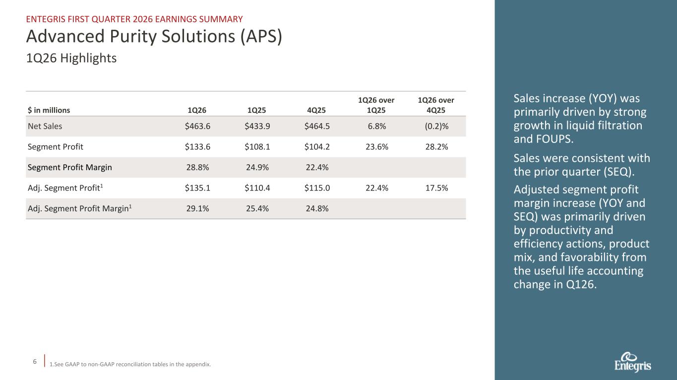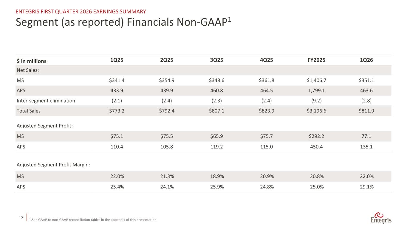 5美元百万元1Q26 1Q25 4Q25 1Q26超1Q25 1Q26超Q4净销售额$ 351.1 $ 341.4 $ 361.8 2.8%(3.0%)分部利润$ 75.9 $ 75.0 $ 63.9 1.2% 18.8%分部利润率21.6% 22.0% 17.7% Adj.分部利润1 $ 77.1 $ 75.1 $ 75.7 2.7% 1.8% Adj.分部利润率1 22.0% 22.0% 20.9%销售额增长(YOY)主要受先进沉积材料推动,选择性刻蚀和CMP耗材销售额下降(SEQ)主要受季节性驱动调整后分部利润率与上一年(YOY)一致调整后分部利润率(SEQ)增加主要是由于整个制造网络材料解决方案(MS)ENTEGRIS 2026年第一季度收益摘要2016年第一季度亮点1.见本演示文稿附录中的GAAP与非GAAP调节表。