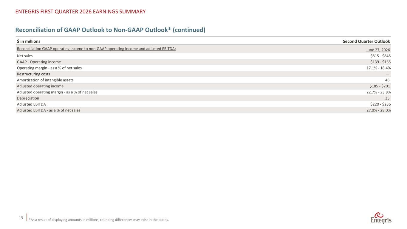 18 Entegris 2026年第一季度收益摘要*由于显示的金额以百万为单位,表格中可能存在四舍五入的差异。GAAP展望与非GAAP展望的对账*百万美元第二季度展望调节GAAP运营费用与非GAAP运营费用:2026年6月27日GAAP运营费用238-244美元净收入调整:无形资产摊销46非GAAP运营费用192-198美元百万美元第二季度展望调节GAAP净收入与非GAAP净收入:2026年6月27日GAAP净收入82-94美元净收入调整:无形资产摊销46所得税影响(11)非GAAP净收入116-129美元百万美元,每股数据除外第二季度展望调节GAAP稀释后每股收益与非GAAP稀释后每股收益:2026年6月27日稀释后每股普通股收益0.53美元-0.61美元稀释后每股普通股收益调整:无形资产摊销0.30所得税影响(0.07)稀释后非GAAP每股普通股收益0.76美元-0.84美元