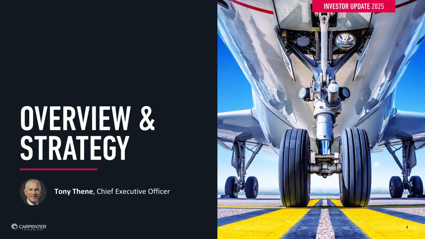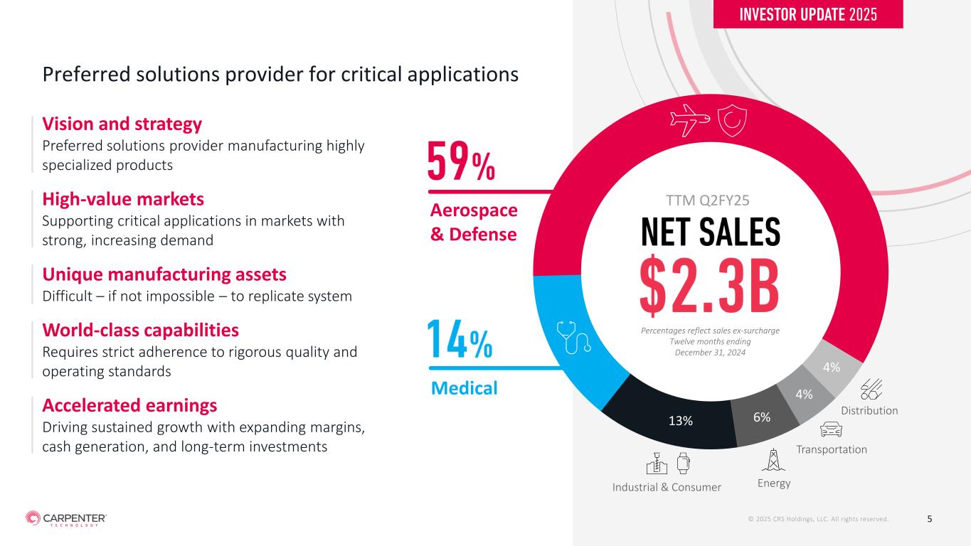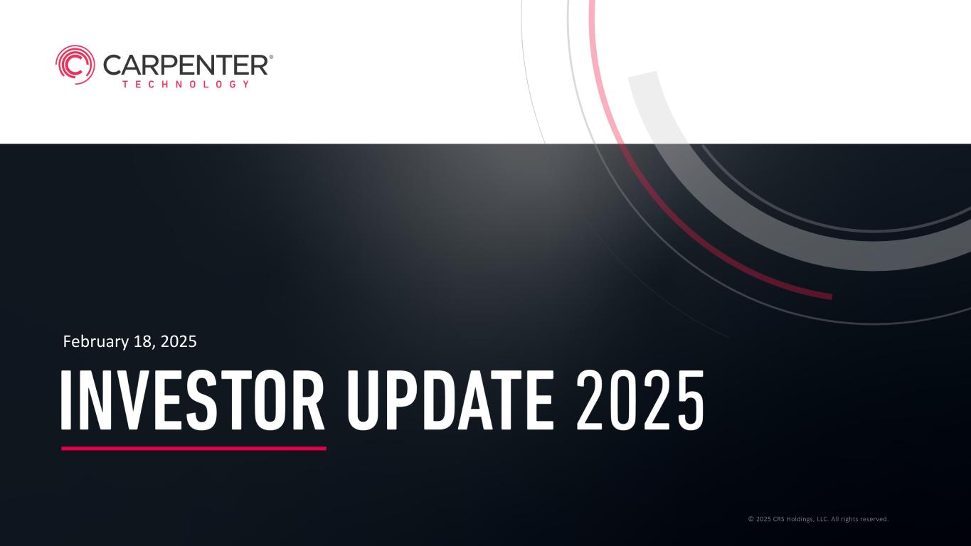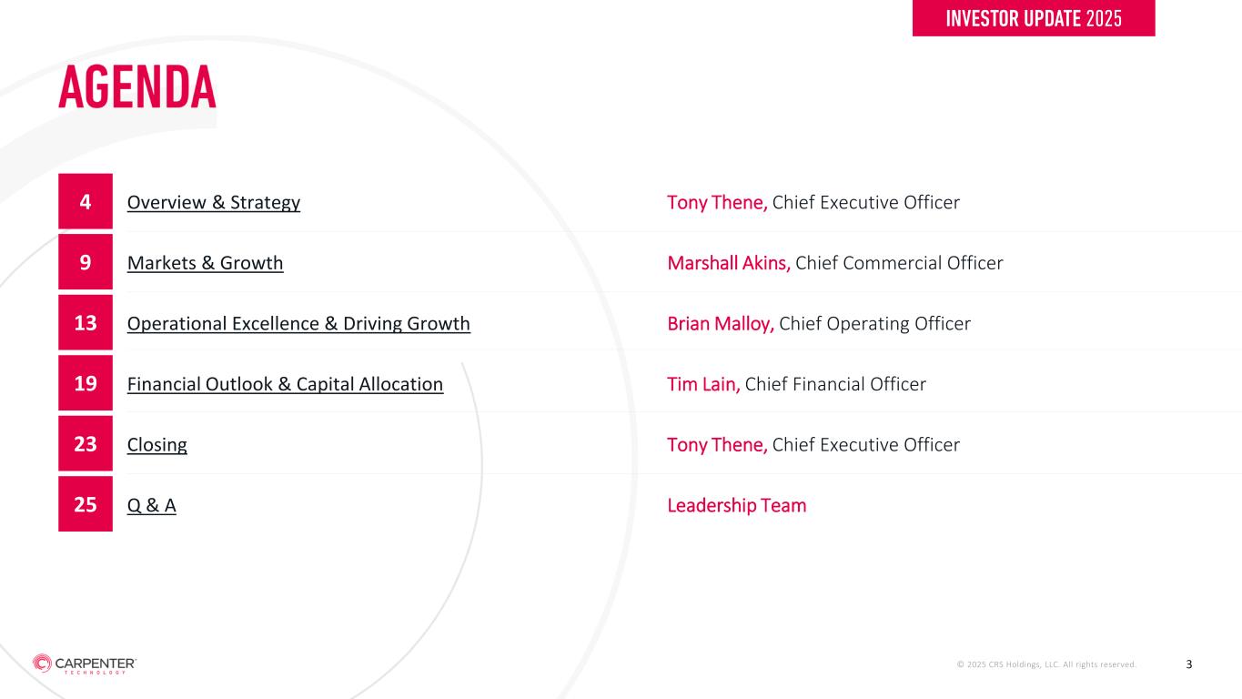 ©2025年CRS控股有限责任公司。版权所有。警示性声明2前瞻性声明本演示文稿包含1995年《私人证券诉讼法案》含义内的前瞻性声明。这些前瞻性陈述受到可能导致实际结果与预测、预期或暗示的结果不同的风险和不确定性的影响。这些不确定因素中最重要的在卡朋特科技提交给美国证券交易委员会的文件中有描述,包括其截至2024年6月30日的财政年度的10-K表格报告、截至2024年9月30日和2024年12月31日的财政季度的10-Q表格,以及这些文件所附的附件。包括但不限于:(1)特种材料业务和某些最终用途市场的周期性,包括航空航天、国防、医疗、能源、交通运输、工业和消费类,或对卡朋特科技业务产生的其他影响,例如新的竞争对手,竞争对手、客户、供应商的整合或制造能力从美国向外国的转移;(2)卡朋特科技实现现金产生、增长、收益、盈利能力、营业收入、成本节约和减少、资质、生产力改进或工艺变化的能力;(3)回收能源、原材料成本增加的能力,运费或其他因素;(4)某些金属的国内外过剩制造产能;(5)货币汇率和利率的波动;(6)政府贸易行为的影响,包括关税;(7)卡朋特科技养老信托中的资产和负债的估值以及养老计划的会计处理;(8)可能的劳资纠纷或停工;(9)我们的客户可能会替代替代替代材料或采用不同的制造做法,从而替代或限制我们产品的适用性;(10)成功收购和整合收购的能力;(11)可向卡朋特科技、其客户或供应链的其他成员;(12)获得能源或原材料的能力,尤其是从位于可能受到不稳定政治或经济条件影响的国家的供应商处获得能源或原材料;(13)卡朋特科技的制造工艺依赖于主要位于宾夕法尼亚州雷丁和拉特罗布以及阿拉巴马州雅典的设施中的高度专业化的设备,如果出现重大设备故障或灾难性事件,这些设施的替代方案可能有限;(14)雇用和留住合格员工队伍和关键人员的能力,包括执行管理团队成员、管理层、冶金学家和其他技术人员;(15)石油和天然气价格和产量的波动;(16)潜在的网络攻击和信息技术或数据安全漏洞的影响;(17)供应商因供应链中断或其他原因履行义务的能力;(18)满足增加的需求、生产目标或承诺的能力;(19)管理自然灾害、气候变化、流行病和传染病爆发的影响以及其他不利的公共卫生发展的能力;(20)与我们的全球业务相关的地缘政治、经济和监管风险,包括地缘政治和外交紧张局势、不稳定和冲突,如乌克兰战争、以色列与哈马斯之间的战争、以色列与真主党之间的战争、胡塞武装袭击商业船只和其他海军舰艇以及遵守美国和外国贸易和税法、制裁、禁运和其他法规;(21)影响商业航空业或主要参与者的挑战,包括但不限于在The Boeing Company的生产和其他挑战;(22)公告的后果,维持或使用卡朋特科技的股份回购计划;及(23)我们成功完成棕地扩建以增加高纯熔体产能以加速长期增长的能力。这些因素中的任何一个都可能对卡朋特科技的经营业绩产生不利的和/或波动的影响。本文件中的前瞻性陈述旨在受制于经修订的1933年《证券法》第27A条(“证券法”)和经修订的1934年《证券交易法》第21E条提供的安全港保护。我们提醒您不要过分依赖前瞻性陈述, 仅在本演示文稿发布之日或此类前瞻性陈述中另有说明的日期发表。卡朋特科技不承担更新或修改任何前瞻性陈述的义务。非GAAP和其他财务指标本演示文稿中包含的财务信息未经审计。此列报中包含的部分信息来自卡朋特科技的合并财务信息,但未在卡朋特科技根据美国公认会计原则(GAAP)编制的财务报表中列报。根据SEC规则,其中某些数据被视为“非GAAP财务指标”。这些非GAAP财务指标补充了我们的GAAP披露,不应被视为GAAP指标的替代方案。与最直接可比的GAAP财务指标和管理层使用非GAAP财务指标的理由的对账可在本演示文稿的附录中找到。
